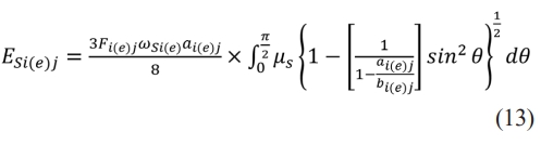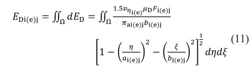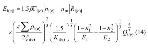 Where β is the elastic hysteresis loss factor; Γi(e) and ξi(e) are the first and second kinds of elliptical integrals, respectively; ni(e) and nm represent the rotational speeds of the bearing raceway and the rolling element, respectively; Ri(e),j is the distance between the contact point and the rotational axis of the rolling element; and Ki(e) is the ellipticity. Ki(e) = αi(e)/bi(e). Where αi(e) and bi(e) are the semi-major and semi-minor axes of the elliptical contact area, respectively; e1 and E1 are the Poisson’s ratio and Young's modulus of the rolling element, respectively; e2 and E2 are the Poisson’s ratio and Young's modulus of the bearing raceway, respectively; and Qi(e),j is the contact load of the j-th ball.