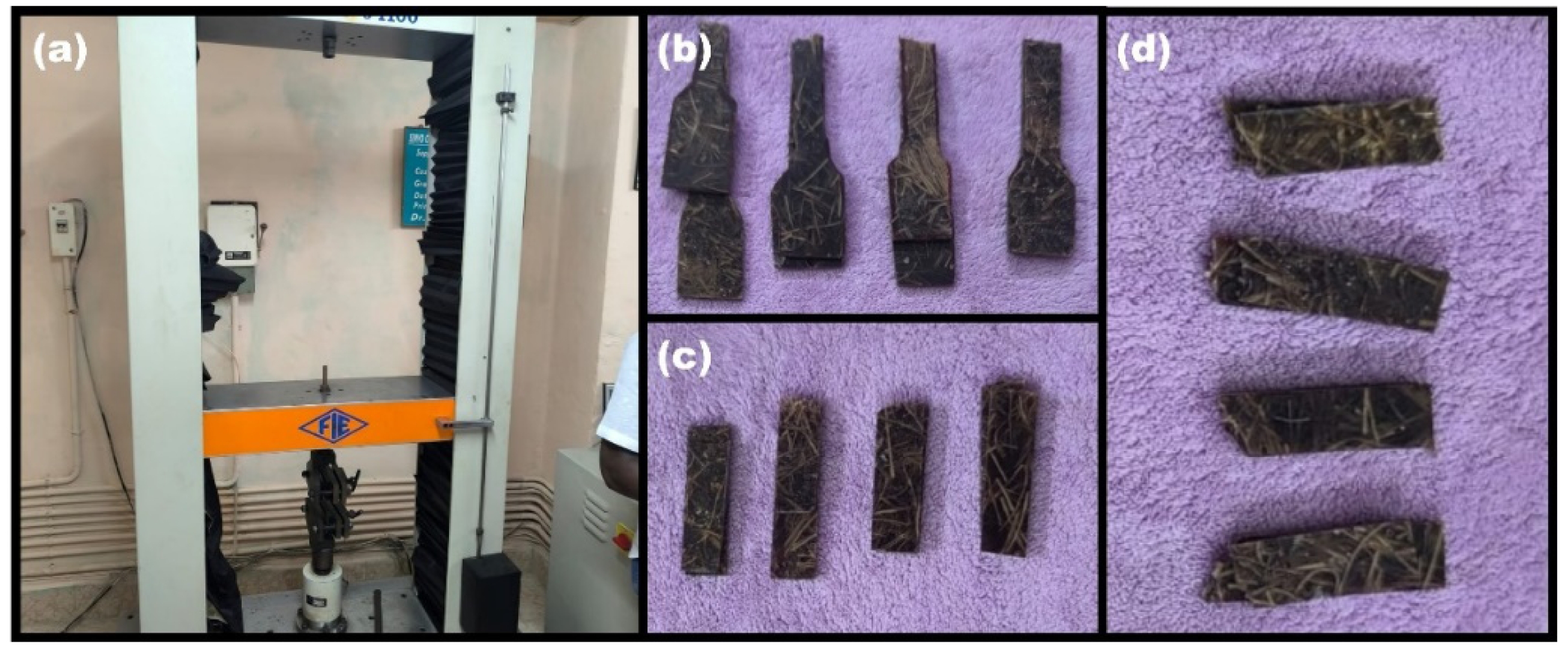 Fig. 4 An illustration of (a) Universal testing machine (b)Tensile test specimens (c) Flexural test specimens (d) Impact test specimens after testing. |