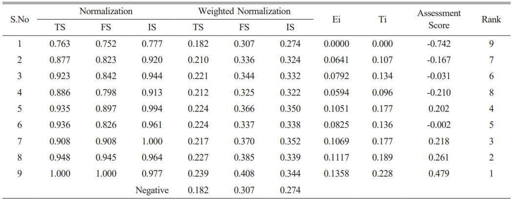 The normalization of the data was executed by using eq. (3). The standard deviations (sj) for each criterion are presented in Table 3 and it was computed using eq. (4). Eq. (6) was employed to determine the data measure values, as illustrated in Table 3. Subsequently, the criterion weights were calculated using eq. (7) and are presented in Table 3.
