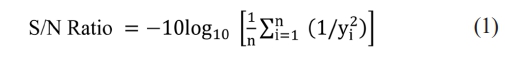 Taguchi optimization technique is employed to evaluate a wide range of data by considering various factors and levels. It is used to assess the impact of input variables on different applications. Mechanical parameters, including tensile strength (TS), flexural strength (FS), and impact strength (IS), were evaluated for the BFF/MF composites. Both the fibers were treated with benzoyl chloride, and their weight percentages served as input variables. The Taguchi technique calculated the signal-to-noise (S/N) ratio to identify optimal factors by minimizing noise. Eq. (1) was employed to determine the optimal S/N ratio for the mechanical properties after all configurations were evaluated based on quality characteristics. The statistical software Minitab 20 was used for optimization. The mechanical strength of polymer-based composites is influenced by the bonding strength at the fiber/matrix interface. Four variables were used: MF (0–12 wt%), BFF (0–12 wt%), LSSP (2–4 wt%), and BT (0–6 wt%). To determine the optimal combination, an L9 orthogonal array was implemented. The L9 orthogonal array was selected in the Taguchi design to maintain a balance between experimental efficiency and statistical reliability. Since the study involved a limited number of key factors (fiber content, filler content, and surface treatment) at three levels each, the L9 array effectively captured their main effects with minimal experiments. Larger arrays like L16 or L27 are typically used when higher-order interactions or additional parameters are investigated; however, they significantly increase the number of trials, time, and material costs. As preliminary trials showed negligible higher-order interactions, the L9 array was sufficient to achieve accurate optimization with reduced experimental complexity and resource consumption.