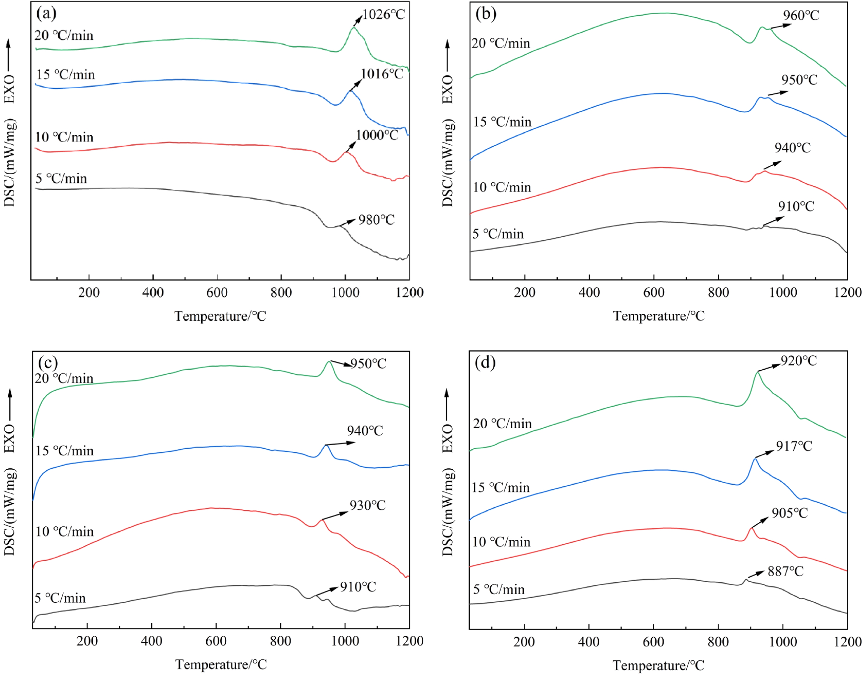 Through systematic processing and analysis of the differential thermal analysis (DTA) data, the DSC curve characteristics of glass-ceramic samples with different B2O3 contents are obtained, as illustrated in Fig. 2. With increasing B2O3 content, the crystallization peak temperature of the base glass decreases under the same heating rate, indicating that the addition of B2O3 effectively reduces the crystallization temperature. At a fixed B2O3 content, the crystallization peak shifts toward higher temperatures as the heating rate increased. By accurately determining the peak temperature (Tp) of the crystallization exothermic peak at different heating rates (β), a quantitative relationship between Tp and β can be established. Based on the Kissinger kinetic equation [18], this dataset can be used to calculate the crystallization activation energy (E), thereby revealing the energy barrier characteristics of phase evolution and the nucleation-growth kinetics within the glass-ceramic system.