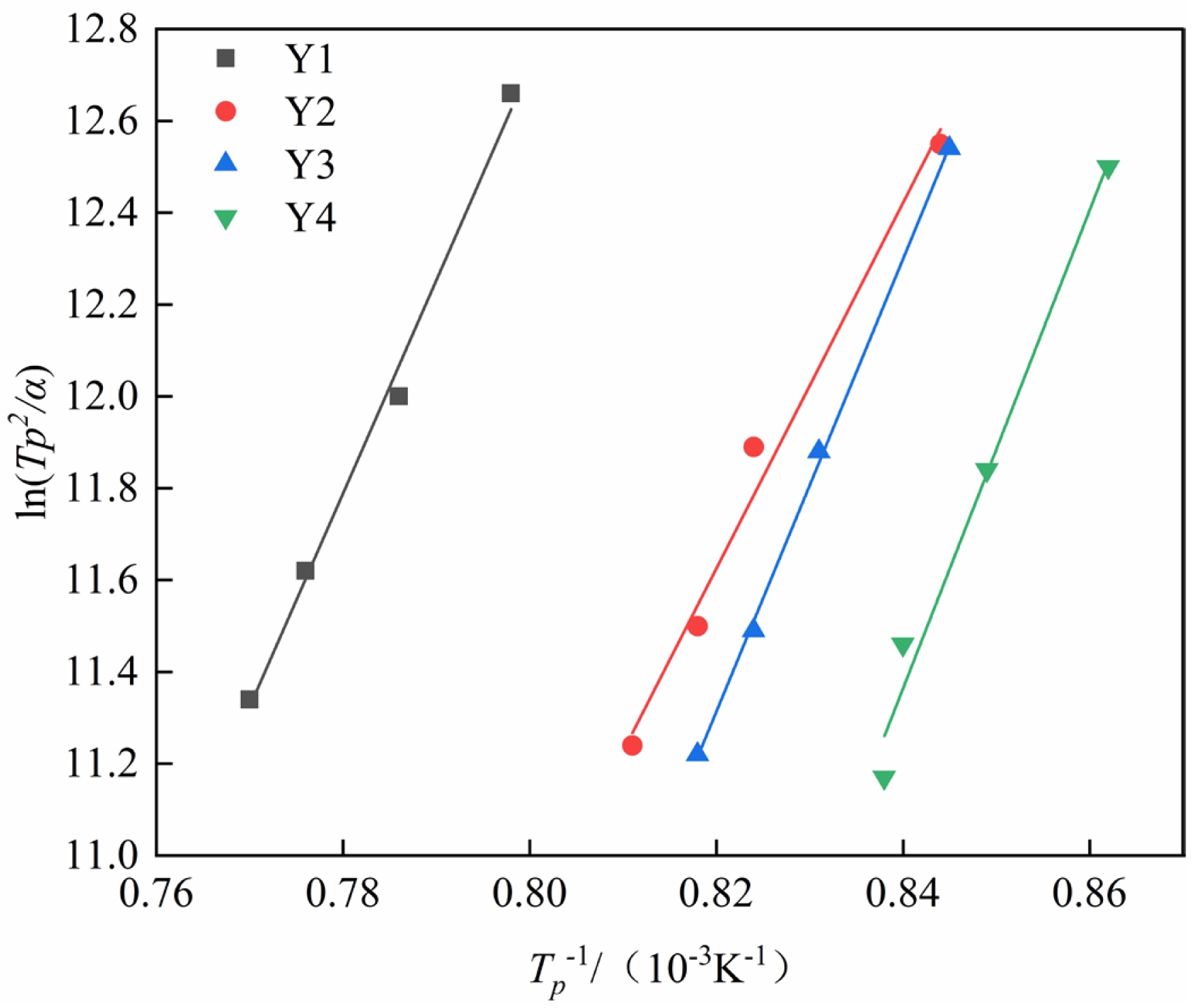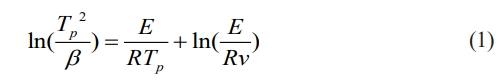 Where Tp is the peak temperature of the exothermic peak in the DSC curve (K); β is the heating rate of the DSC curve, ℃/min; R is the universal gas constant; E is the crystallization activation energy, kJ/mol; and ν is the frequency factor.