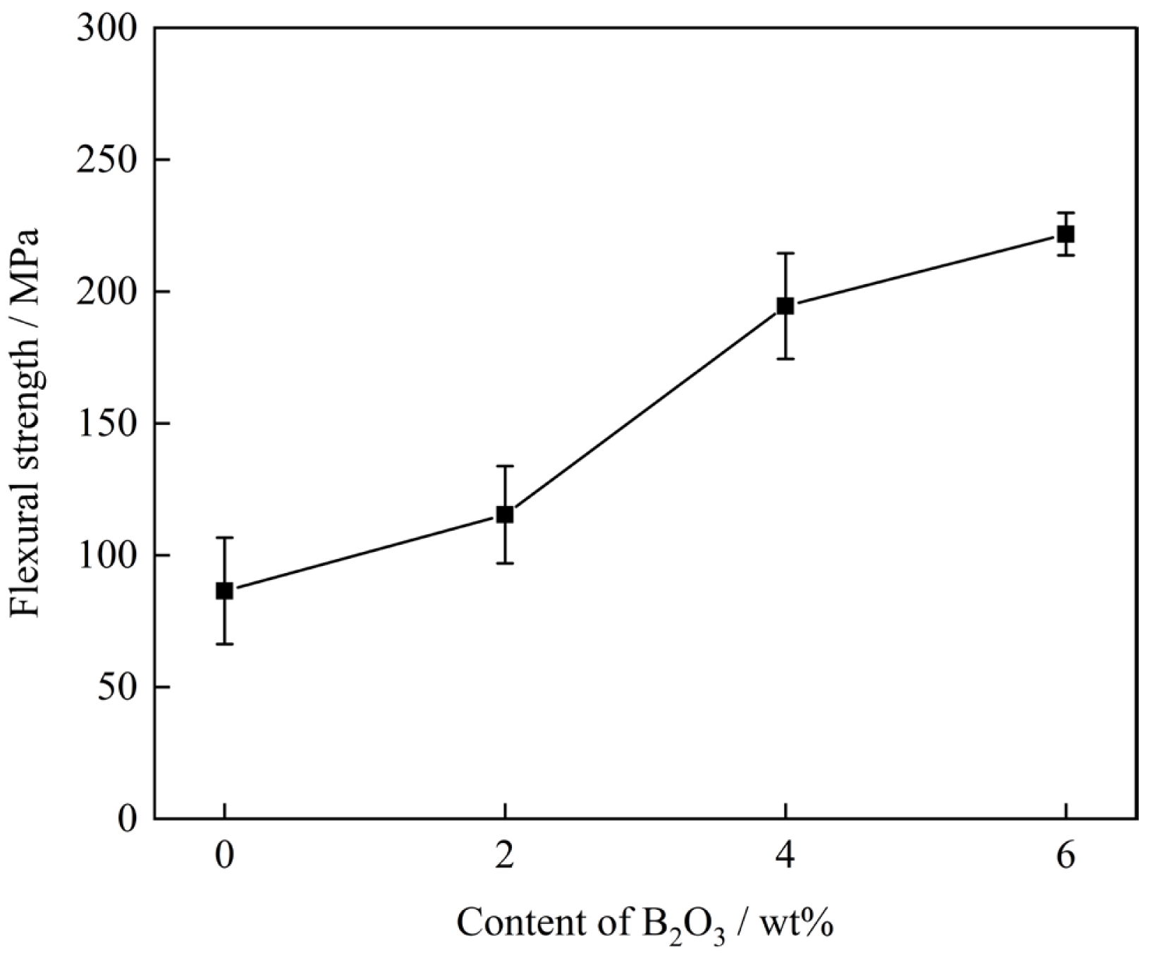 Fig. 9 presents the flexural strength of glass-ceramic samples with different B2O3 contents. The measured average flexural strength values were 86.25 MPa, 115.35 MPa, 194.48 MPa, and 221.75 MPa, respectively. As the B2O3 content increased, the flexural strength of the glass-ceramics improved. The sample with 6 wt% B2O3 exhibited the highest flexural strength. This enhancement is attributed to the refinement of the crystalline phases, which were more uniformly distributed and free from significant defects due to the incorporation of B2O3.