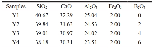 After the carbothermal reduction of modified copper slag, the reduction tailings composed primarily of SiO2, CaO, and Al2O3 was obtained. In consideration of the residual Fe2O3 present in the reduction tailings, the Fe₂O₃ content was fixed at 2 wt%. Based on its main components, (CaO-Al2O3-SiO2-Fe2O3) CASF base glass was formulated with a mass ratio of x wt% B2O3, 2 wt% Fe2O3, and (98–x) wt% of 41.50 wt% SiO2, 32.95 wt% CaO, and 25.55 wt% Al2O3. The value of x was varied at 0, 2, 4, and 6 wt% to investigate the effect of B2O3 content. Table 1 lists the chemical composition of the CASF base glass.
