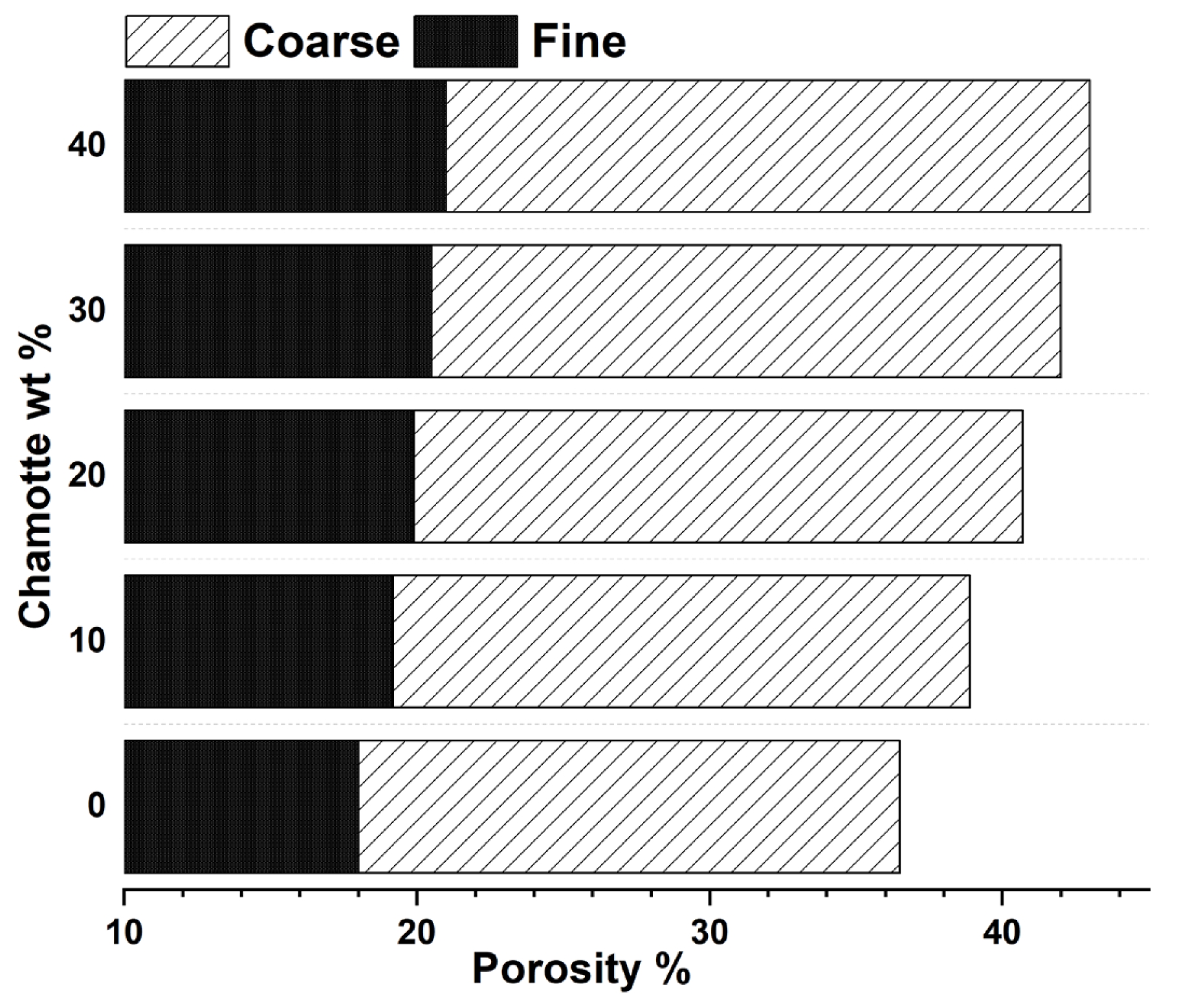 For both fine and coarse particle sizes, permeability rises with chamotte content; coarse chamotte consistently shows higher permeability than fine (Fig. 4). Although fine chamotte only reaches ~0.35×10-¹² m² coarse chamotte reaches ~0.54×10-¹² m² at 40 wt.%. The difference results from the particle size effect: fine chamotte creates smaller, more evenly distributed pores that offer moderate permeability and preserving structural cohesion, whereas coarse chamotte introduces larger inter-particle voids and channels that improve water vapor transport during drying. Increased permeability in bodies containing coarse chamotte makes it easier for moisture to migrate, which lowers the risk of breaking in thick or dense ceramics and reduces internal drying stresses. These results demonstrate how important chamotte particle size is in modifying the transport characteristics of ceramic materials.