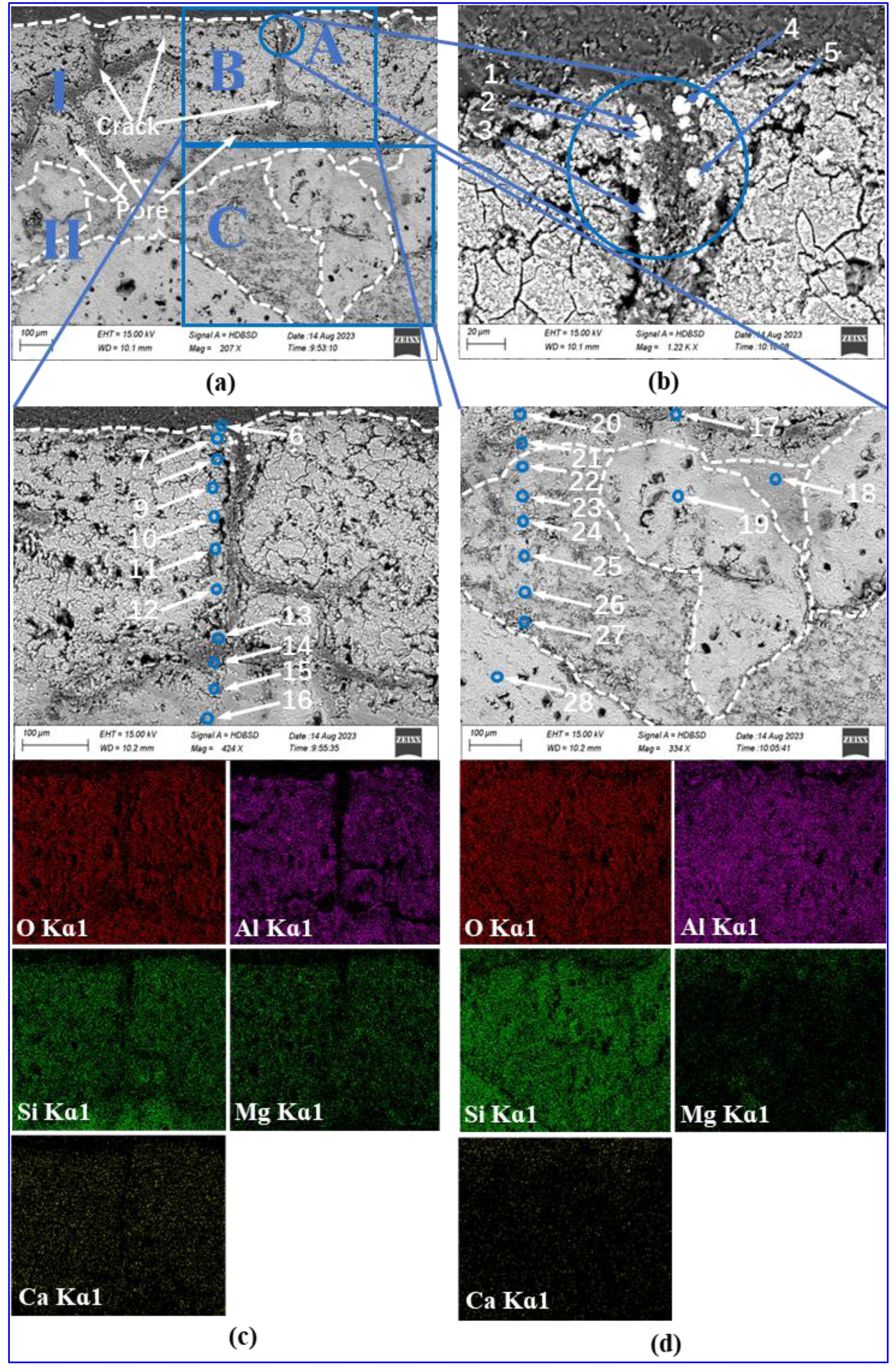 Fig. 3 presents the XRD patterns of the saggar blocks sintered at various temperatures. In the temperature range of 1320 to 1380 °C, the primary crystalline phases consist of cordierite (Mg2Al4Si5O18), mullite (Al6Si2O13), corundum (Al2O3), and silica (SiO2). The absence of diffraction peaks corresponding to Foshan yellow clay and coal gangue confirms the complete decomposition of the kaolinite in the clay [28]. The diffraction patterns reveal systematic phase transformations with increasing temperature: the peak intensities of SiO2 and Al2O3 gradually decrease while those of cordierite and mullite increase. This is attributed to the liquid-phase reaction of SiO2 and Al2O3, forming mullite and cordierite (Equations 1 and 2) [28]. At 1410 °C, the diffraction peaks of SiO2 disappear completely, accompanied by reduced intensity in the diffraction peaks for mullite, cordierite, and corundum. This phenomenon occurs because trace oxides (CaO, Fe₂O₃, TiO₂) lower the system’s eutectic point, promoting liquid phase formation that diminishes the crystallinity of the primary phases [29].