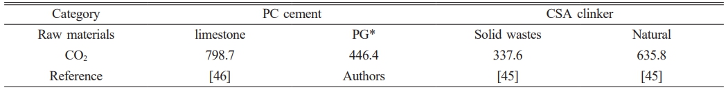 Ren et al. [49] prepared CSA clinker from red mud, desulfurization gypsum, and other industrial solid wastes, and the results were compared with a standard production method. The found that 635.8 Kg of CO2 were produced per tonne of cement clinker, including raw materials and fossil fuels processing, electricity production, transportation, and atmospheric emissions from the kiln for conventional CSA preparation, but only 337.6 Kg of CO2 were released when using industrial solid wastes to produce 1 tonne of clinker. Li et al. [50] give detailed LCA study for Portland cement (PC), which 798.7 Kg of CO2 were produced per tonne of cement. According to the calculation method of conventional PC, the CO2 emission is 446.4 Kg per tonne cement by using PG, including raw materials (for example, PG dehydration) and fossil fuels processing, electricity production, and atmospheric emissions. Greenhouse gas emission results of different cement/clinker are shown in Table 2.
