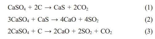 Gypsum initial decomposition temperature reaches 1662 ℃ by thermodynamic calculation, but the decomposition temperature decreases significantly in the presence of reducing agents, such as coke, sulfur, hydrogen or carbon monoxide, which the decomposition temperatures are 849, 1054, 909 and 925 ℃, respectively. Xiao et al. [11] discover that initial decomposition temperature of CaSO4 is 1246 ℃ in air atmosphere, and the end temperature is 1395 ℃, probably because of trace impurities in the gypsum can promote it decomposition. Coal, coke, sulfur, CH4, CO and H2 can all be used as reducing agents for gypsum decomposition. On the other hand, coal, coke and sulfur are a solid and easily stored and used in industry. Moreover, sulfur and H2 do not emit carbon dioxide and is environmentally friendly. The reducing agent can reduce the decomposition temperature of gypsum and increase the decomposition rate. Among these reducing agents, coal or coke (carbon) has a lower cost and is suitable for industrial application. The mechanism of carbon as reducing agent to decompose gypsum can divide into two types: solid-solid reaction mechanism and gas-solid reaction mechanism. It is generally believed that the reaction between gypsum and carbon are mainly solid-solid reaction in packing mode, and the gas-solid reaction is the main reaction in suspending mode [12].