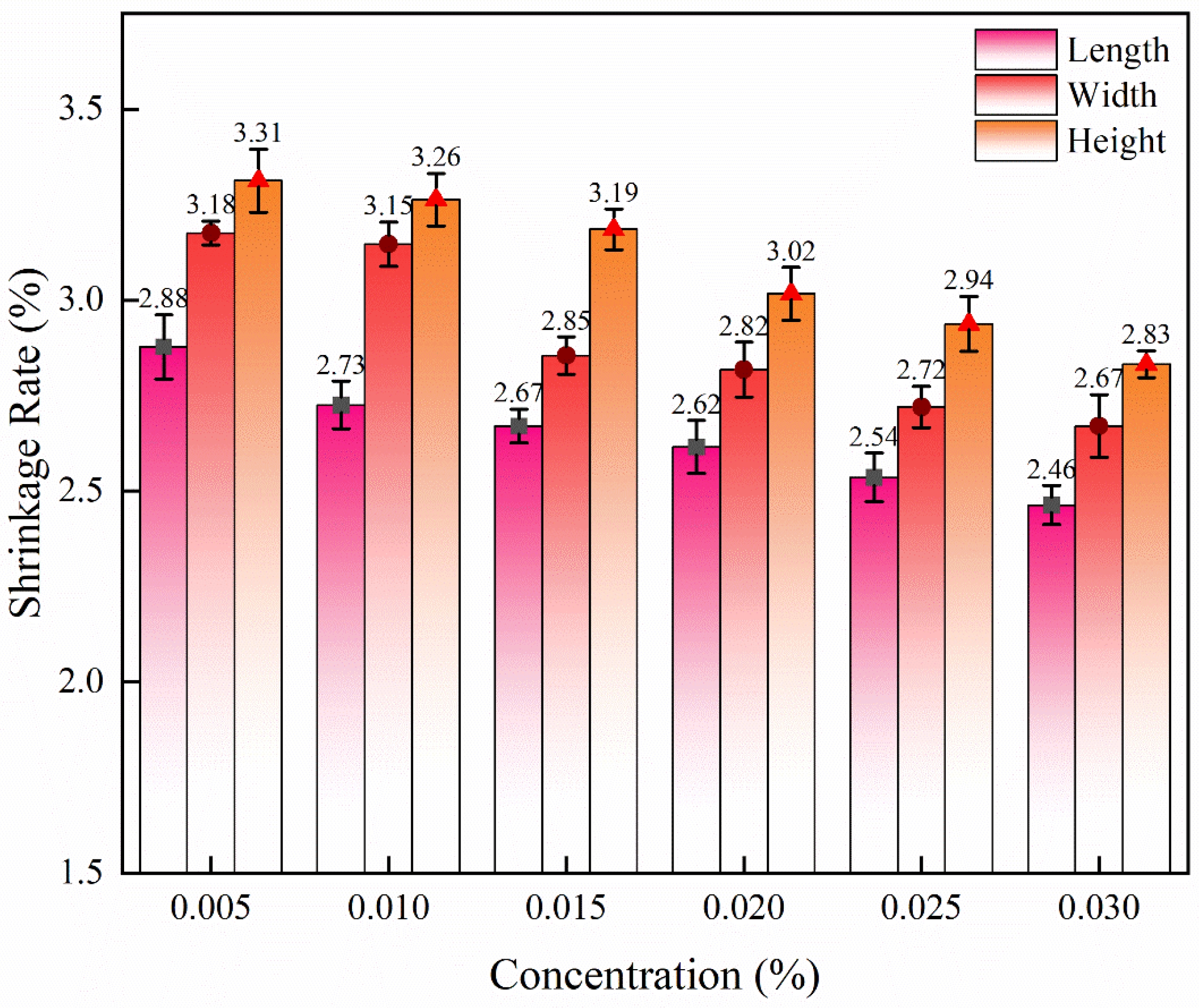 The shrinkage rate of the sintered samples is related to the solid content, porosity and density after sintering. Due to the anisotropy of 3D printed ceramics, the shrinkage rate of the samples in different directions is significantly different [48-51]. The shrinkage in the length direction and the width direction is mainly related to the structure density caused by the intra-layer particle rearrangement, while the shrinkage in the height direction is mainly caused by the intra-layer and inter-layer particle rearrangement. Therefore, the height direction usually has a higher shrinkage rate.