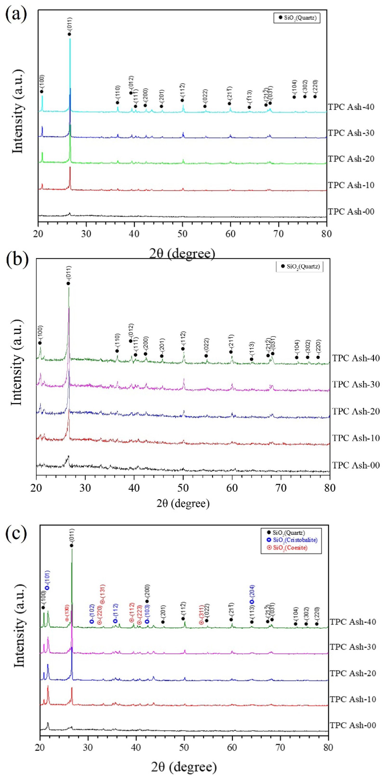 Figure 1 shows the XRD patterns of different quartz composition in coal fly ash calcined from 900 ℃ to 1100 ℃. In general, calcination temperatures are chosen within 0.5–0.8 of the melting point (K) of the target material, which ensures sufficient solid-state diffusion to enable decomposition, phase transformation, or crystallization [15, 16]. Consequently, since fly ash is mainly composed of SiO₂ (melting point 1743 K) and Al₂O₃ (melting point 2345 K), the calcination temperature was deliberately selected in the range of 900–1000 °C. This range allows adequate reactivity for silica to agglomerate, while avoiding excessively high temperatures that could trigger unwanted reactions of alumina. After calcination, pure coal fly ash did not exhibit any significant phase transformation, the primary phase probably corresponds to a weak α-quartz phase (SiO₂, JCPDS Card No. 78-2315). However, the primary structure of silicon dioxide in the coal fly ash were still considered to be amorphous for all the calcination temperature. Upon the addition of 10%, silicon dioxide α-quartz becomes the dominant phase, this is attributed to the addition of 10% quartz. Furthermore, it was observed that the intensity of the quartz phase increased proportionally with the added quartz content from TPC Ash-10 to TPC Ash-40. The phase structures were compared with the Powder Diffraction Database, confirming that all the samples primarily exhibit the pure α-quartz phase, adopting a hexagonal crystal system (space group P6₄21 or P6₂21). According to the phase diagram of SiO2 [17], quartz exists as β-quartz phase at high temperatures and transforms to α-quartz at room temperature. Consequently, most of all samples exhibit the same single quartz phase at 900 ℃ and 1000 ℃ as shown in Fig. 1(a) and 1(b). However, when calcination temperature raises to 1100 ℃, some secondary phases can be found in the patterns due to phase transition at high temperature, such as cristobalite (JCPD cards No.82-0512) and coesite (JCPD cards No.77-1726), as shown in Fig. 1(c).