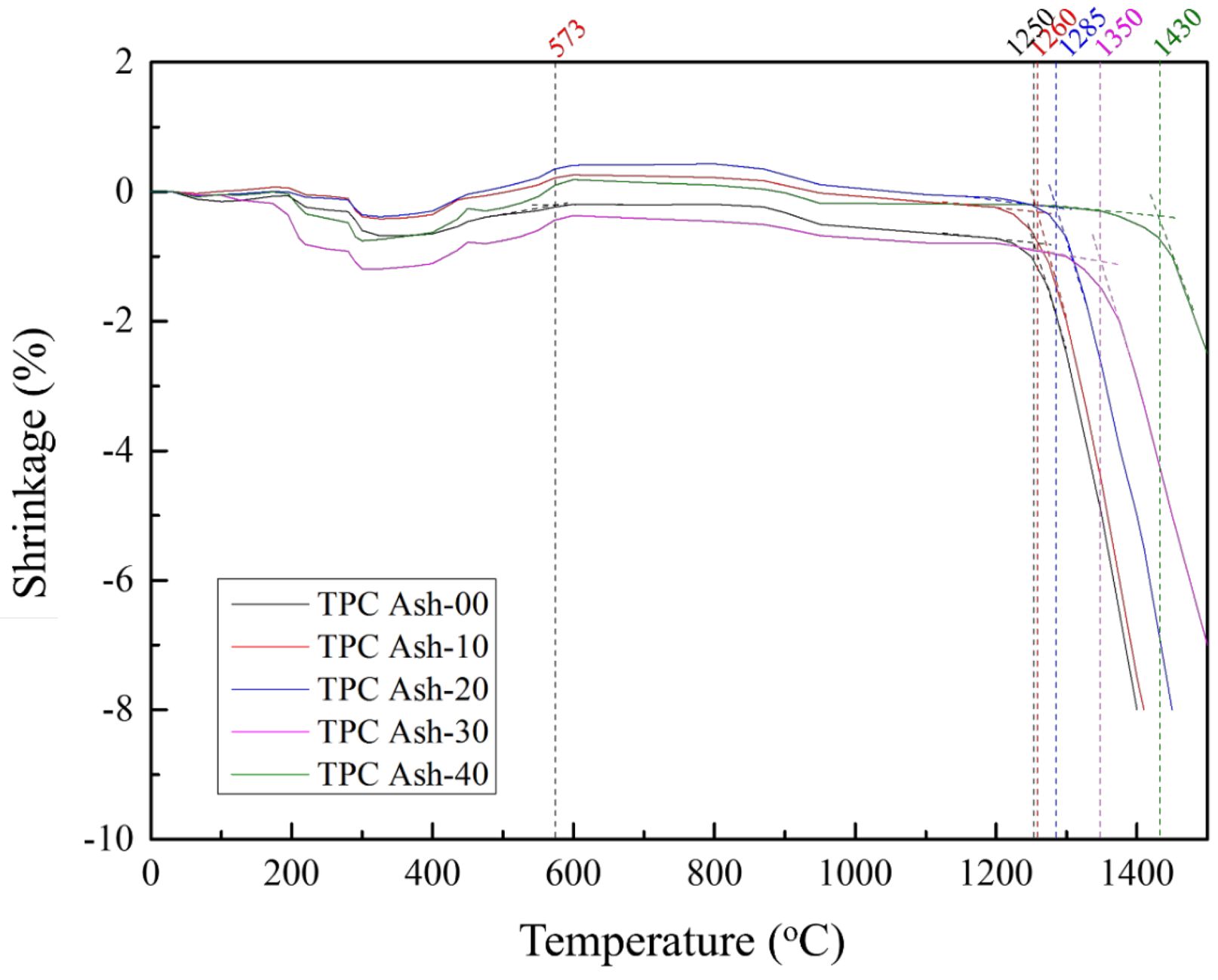 To investigate the sintering characteristics of coal fly ash with 0%, 10%, 20%, 30%, and 40% quartz content, we performed thermomechanical analysis (TMA) on the calcined regenerated SiO₂ using a thermal analyzer. During the preparation of test specimens, due to the lack of adhesion in the calcined powder, polyvinyl alcohol (PVA) was added to form tablet-shaped samples. According to the TMA results in Fig. 6, all renewable SiO₂ samples exhibited a slightly expansion point at approximately 537°C, which is inferred to correspond to the α-quartz to β-quartz phase transition [28, 29]. When the temperature exceeds 1250 °C, the specimens exhibit significant length shrinkage, which is attributed to the onset of densification as the material approaches its melting point [30]. This phenomenon is referred to as the initial shrinkage temperature. Furthermore, it is observed that the initial shrinkage temperature increases with the addition of quartz. This is attributed to high β-quartz SiO₂ content in TPC Ash-40, which prevents significant shrinkage, thus inhibiting noticeable shrinkage [30, 31]. Compared to β-quartz, which has a high melting point (~1700 °C) [32], fly ash primarily consists of amorphous silica (approximately 60%) and alumina (around 30%) [11, 33]. Due to the lower melting points of these components relative to β-quartz, the overall melting behavior of fly ash is significantly different. As the proportion of β-quartz increases, the initial shrinkage temperature also rises. This can be attributed to the thermal stability of β-quartz at high temperature, which impedes the densification process at lower temperatures, thereby delaying the onset of sintering and structural shrinkage.