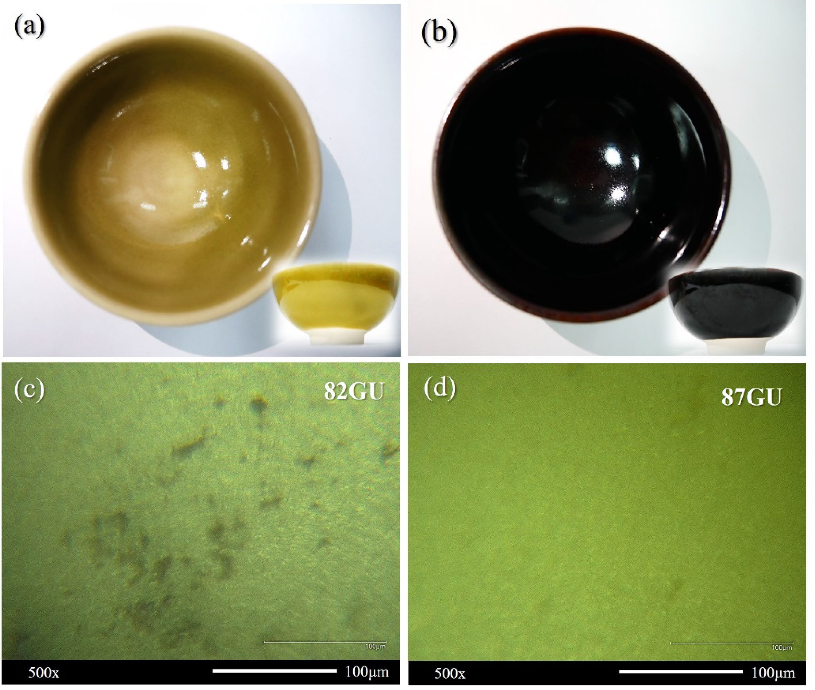 Figures 8(a)–(b) present optical images of ceramic teacups colored with CuO and Fe₂O₃, respectively. The results indicate that the glaze exhibited no visible surface defects, with uniform adhesion and even color distribution, without noticeable variations. Additionally, no glaze accumulation or flow was observed at the lower edges of the cups. However, these microstructural characteristics had minimal impact on the glossiness of the glaze, as the measured gloss values remained above 80 GU, as shown in Fig. 8(d). Optical microscopy analysis of the glaze surface revealed fine crystalline grains in CuO samples, while Fe₂O₃ samples exhibited both fine grains and minor mottling [40, 41].