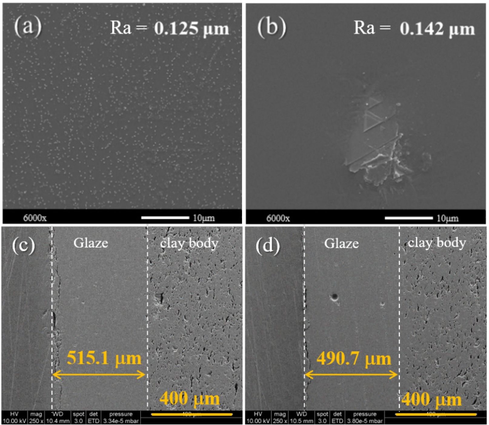 Figures 9(a) and (b) show the SEM surface morphology for CuO glaze and Fe₂O₃ glaze adopted recycled SiO2. CuO glaze with recycled SiO2 shows some nano-crystal on the surface and CuO glaze with recycled SiO2 present some micro-structure. But basically, there does not affect the surface roughness much. Besides, the surface roughness for CuO samples and Fe₂O₃ samples were 0.125 and 0.142 um. According to the literature [42], achieving the glossy appearance characteristic of ceramic glazes generally requires a surface roughness in the range of Ra 0.2–0.4 μm. Accordingly, the present results demonstrate that glassy phases of copper oxide and iron oxide ceramic glazes can be effectively mixed with recycled silica, yielding low surface roughness and thereby producing a favorable visual effect. SEM images in Figs. 9(c) and (d) revealed that, although the CuO-based formulation exhibited some residual bubbles, both formulations achieved a dense, pore-free cross-sectional structure at the optimized sintering temperature. Additionally, a well-bonded interface between the glaze layer and the ceramic body was observed. The measured glaze thicknesses were 515 μm and 490 μm, respectively. These results indicate that regenerated SiO₂ can successfully replace quartz in ceramic glaze formulations.