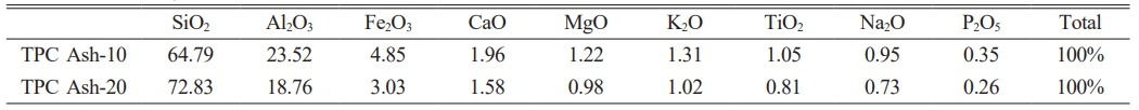 Table 1 presents the XRF analysis results for TPC Ash-10 and TPC Ash-20 following calcination. As reported in a previous study [11], the chemical compositions of both samples closely resemble that of conventional coal fly ash. The addition of quartz primarily results in an increased concentration of silicon dioxide (SiO₂), while the concentrations of other major oxides—such as aluminum oxide (Al₂O₃), iron oxide (Fe₂O₃), calcium oxide (CaO), potassium oxide (K₂O), and titanium dioxide (TiO₂)—remain largely unchanged. These findings indicate that the fundamental chemical characteristics of the fly ash are retained, with the observed variations primarily attributable to the externally introduced quartz.