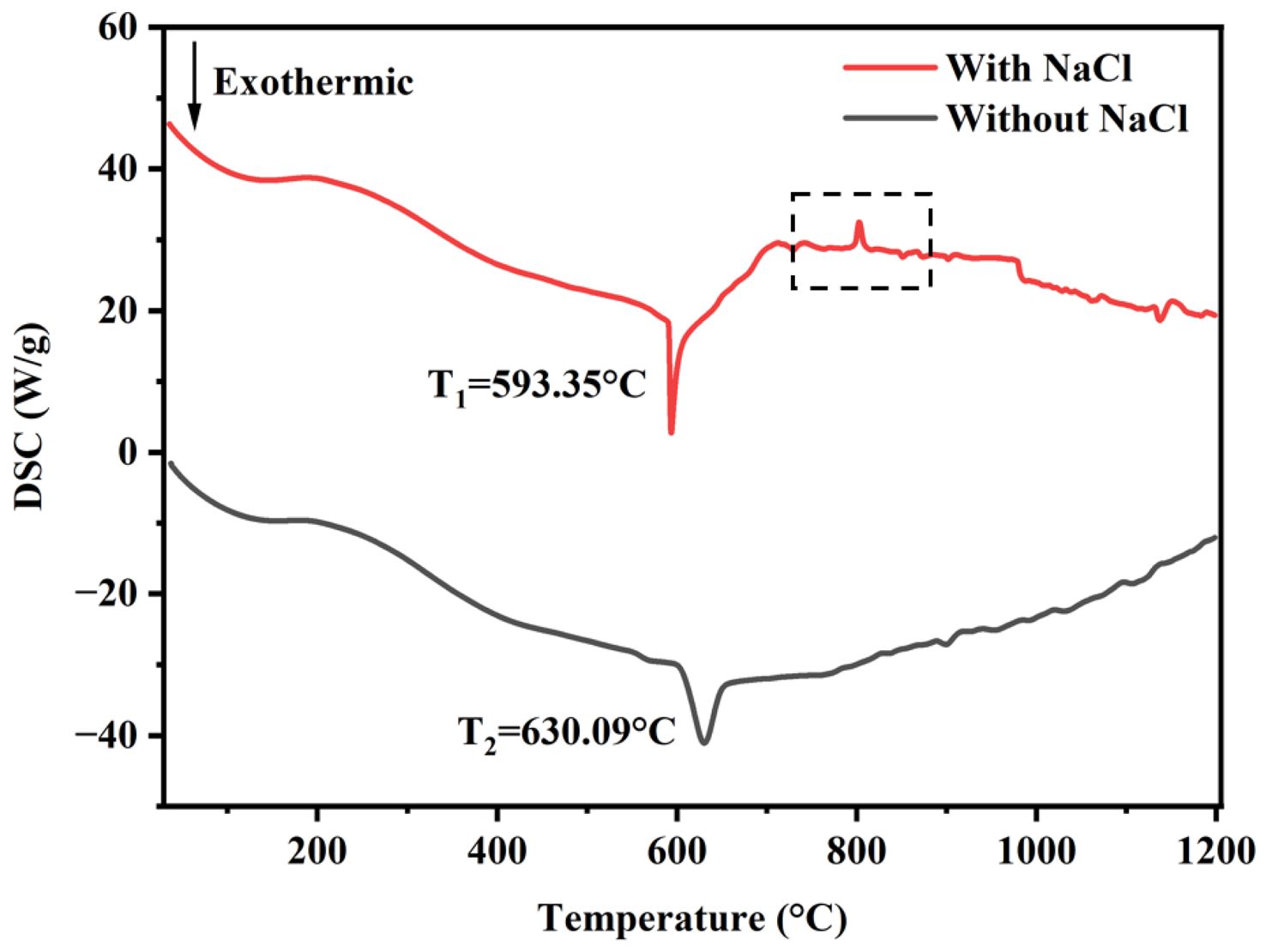 Upon the addition of NaCl to the TiO2-C-Mg system, the calculated adiabatic temperature is presented in Fig. 2. During the combustion synthesis of TiC under experimental conditions, the adiabatic temperature of the system decreases progressively with increasing NaCl content. The reduction reaction is accompanied by the release of a significant amount of thermal energy. However, given that NaCl possesses a relatively low melting point (1074 K) and boiling point (1735 K), a portion of the generated heat is absorbed by NaCl to facilitate its phase transitions, thereby reducing the overall adiabatic temperature of the system. Fig. 3 presents the differential scanning calorimetry (DSC) curves of the two samples. The results indicate that the addition of the diluent NaCl lowers the overall onset temperature of the SHS reaction; furthermore, the incorporation of NaCl introduces a new endothermic peak, thereby contributing to a reduction in the system's undercooling.