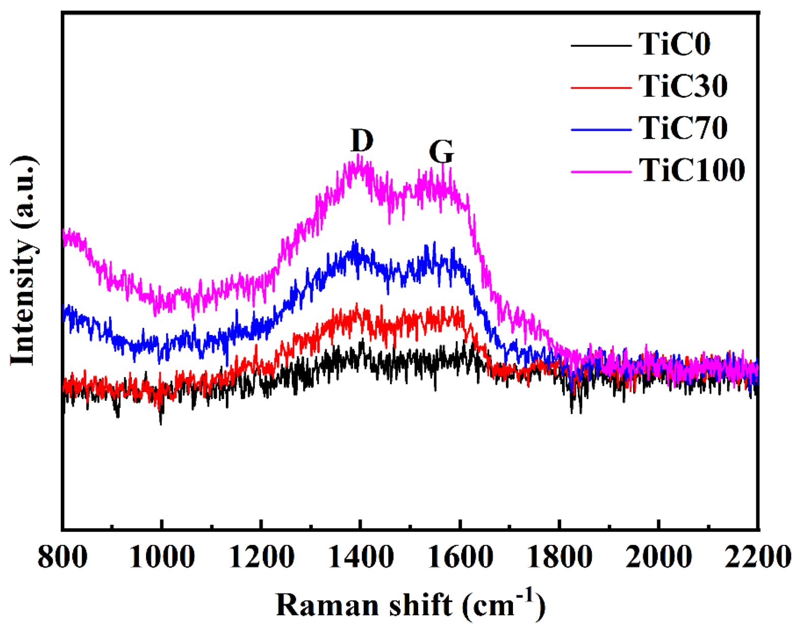 To investigate the distribution of free carbon in the synthesized TiC, Raman spectroscopy was performed on samples prepared under varying NaCl content conditions, with results presented in Fig. 5. The Raman spectra reveal the presence of graphite characteristic peaks (G band) at 1600 cm⁻1 and disorder-induced peaks (D band) at 1350 cm⁻1, indicating the existence of free carbon within the TiC powder. This is likely attributed to the graphite carbon source, which possesses a high fixed carbon content and relatively low chemical reactivity, leading to minor carbon residue after the reaction. As the NaCl content increases, the intensity of the carbon-related peaks rises significantly, suggesting a corresponding increase in free carbon content. This observation aligns with the EDS elemental analysis results, which also show an increase in the C content. With the reduction in particle size, the specific surface area increases, resulting in greater surface adsorption of carbon. Moreover, the ultrafine nanostructure of the synthesized TiC powder further contributes to the broadening of the main Raman peaks.