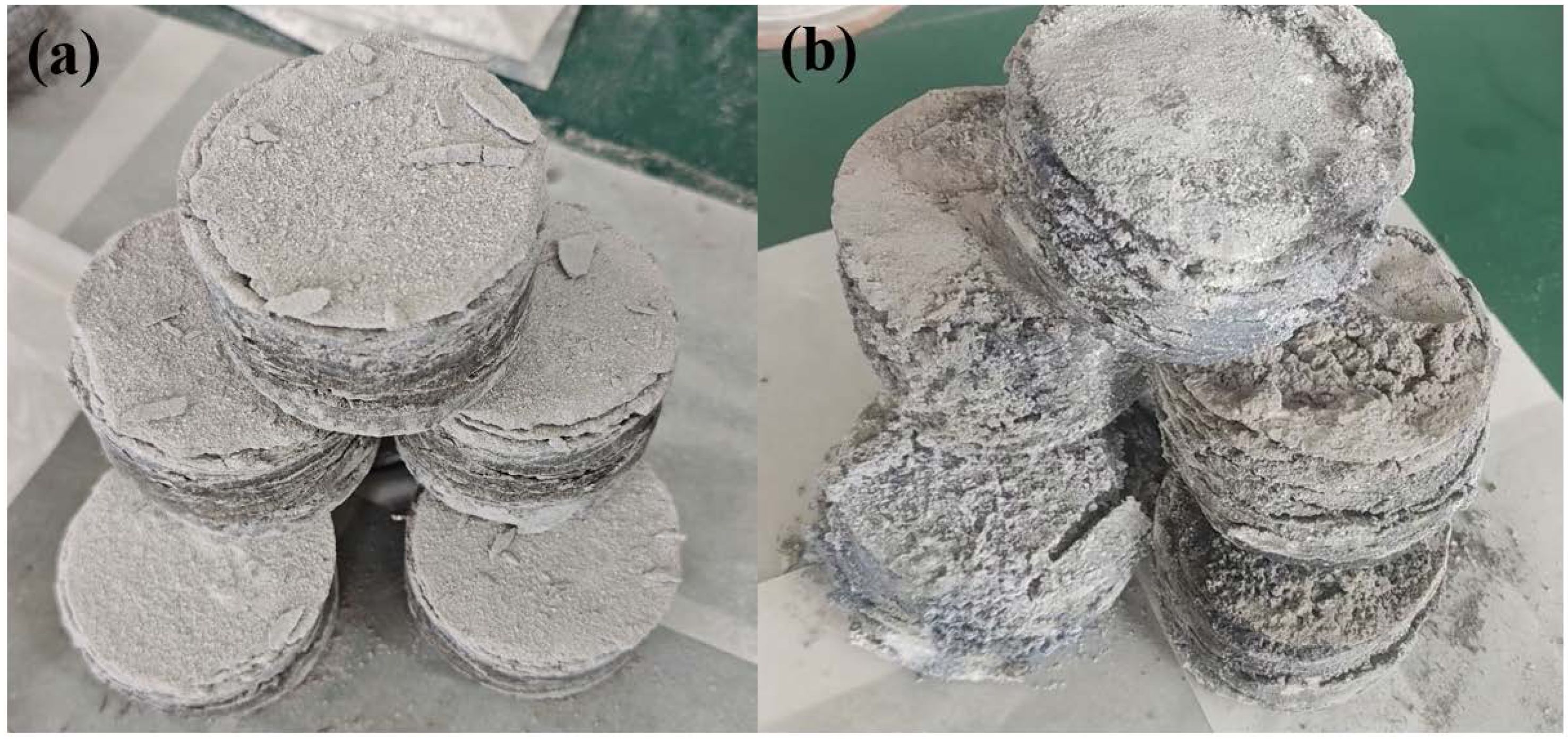 Fig. 12 Large-scale preparation of TiC powder: (a) before combustion, (b) after combustion. |