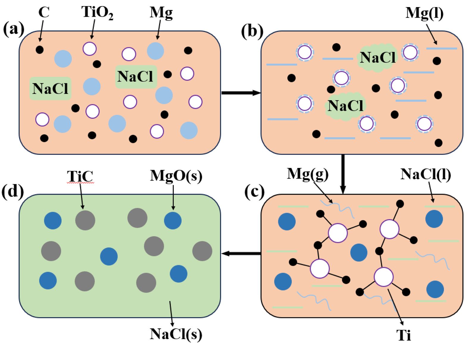 In the TiO2-C-Mg reaction system, all reactions occur within a sealed environment. Thermodynamic analysis reveals that during the combustion synthesis of TiC, the system's adiabatic temperature decreases from 3200 K to 1488 K. Compared to the reducing agent Mg powder, NaCl possesses a higher melting point, which facilitates the reduction process. During the preheating stage, as illustrated in Fig. 14a, nanoscale reactants are uniformly distributed among the auxiliary materials. When the system temperature exceeds 500 K, the ignition agent is activated, initiating a reaction that releases a significant amount of heat. As the temperature rises to approximately 1800 K, a self-propagating reaction is triggered among the reactants. Due to its lowest melting point, Mg begins to melt when the system reaches 923 K. The molten Mg infiltrates and diffuses into the solid particles, forming a coating layer, as shown in Fig. 14b. The reduction of oxides to form MgO is an exothermic reaction that generates a large quantity of heat in a short period. Upon reaching the melting point of NaCl (1076 K), the salt melts and absorbs heat, thereby reducing the rate of temperature increase and effectively suppressing rapid grain growth. Meanwhile, localized regions may reach the boiling point of Mg (1378 K), at which point Mg volatilizes into vapor, promoting a more complete reduction reaction, as depicted in Fig. 14c. When the system approaches the boiling point of NaCl (approximately 1700 K), the rate of temperature rise sharply declines due to extensive NaCl volatilization and associated heat absorption. The system reaches thermal equilibrium when the heat released by the magnesiothermic reaction equals the heat absorbed during NaCl phase transitions, at which point the temperature stabilizes at the adiabatic value. During the subsequent cooling phase, once the temperature drops below the melting point of NaCl, the molten salt solidifies and crystallizes, encapsulating the formed carbides and effectively preventing further particle growth, as shown in Fig. 14d.