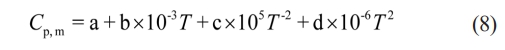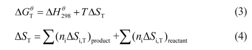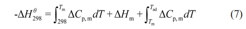 In the formula, ∆H298q (kJ·mol-1) represents the standard formation enthalpy of the product at 298 K, ∆Cp,m (J·K-1) is the heat capacity of the product, Tm (K) is the melting point of the product, and ∆Hm (J·kg-1) is the melting heat of the product. Cp,m can be approximately calculated using the following formula (8):