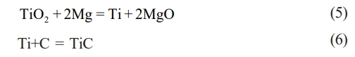 In this study, the TiO2–C–Mg system was employed for the combustion synthesis process. The reaction mechanism comprises two sequential steps: the first involves the reduction of TiO2 by Mg, and the second entails the reaction of the resulting titanium with carbon to form the final TiC product. The specific reaction equations corresponding to the synthesis of TiC are Eq. (5) and (6).