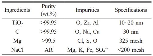 Nano-sized TiC was successfully synthesized on a large scale through combustion synthesis. To minimize the impact of raw materials on the properties of the resulting powder, titanium dioxide (TiO2) and carbon black were both selected as nano-sized precursors. Detailed specifications of the raw materials are provided in Table 1.