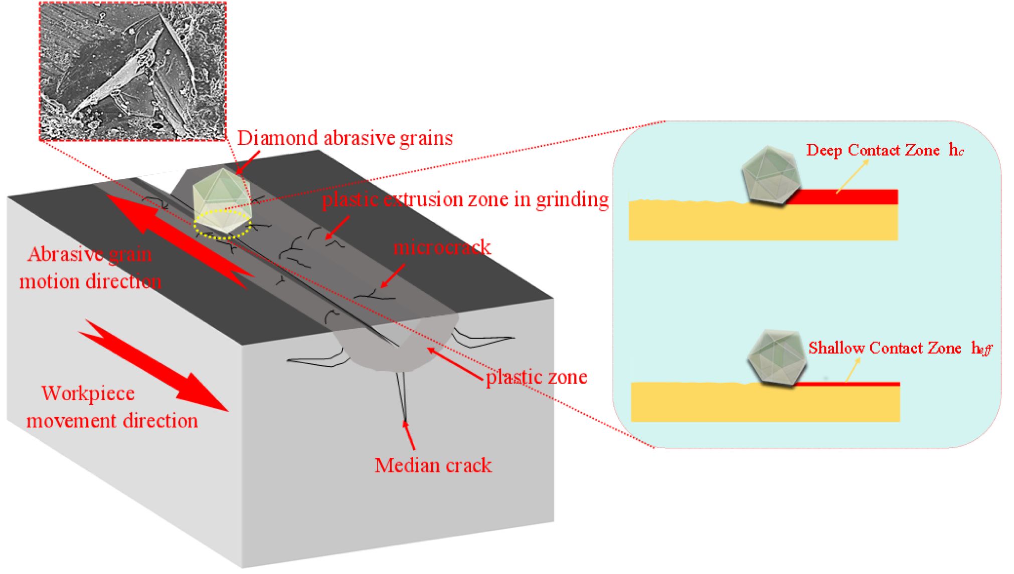 In response to the above situation, one scenario is that the material removal process by the abrasive is dominated by the spherical tip of the abrasive, corresponding to a shallow contact area; the other is dominated by the conical part of the abrasive, corresponding to a deep contact area.