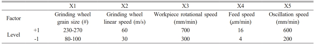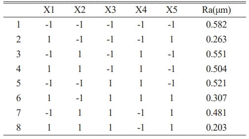 The factors and levels are coded. The factors are identified as five machining parameters, and two representative levels of them are selected, as shown in the Table 3: