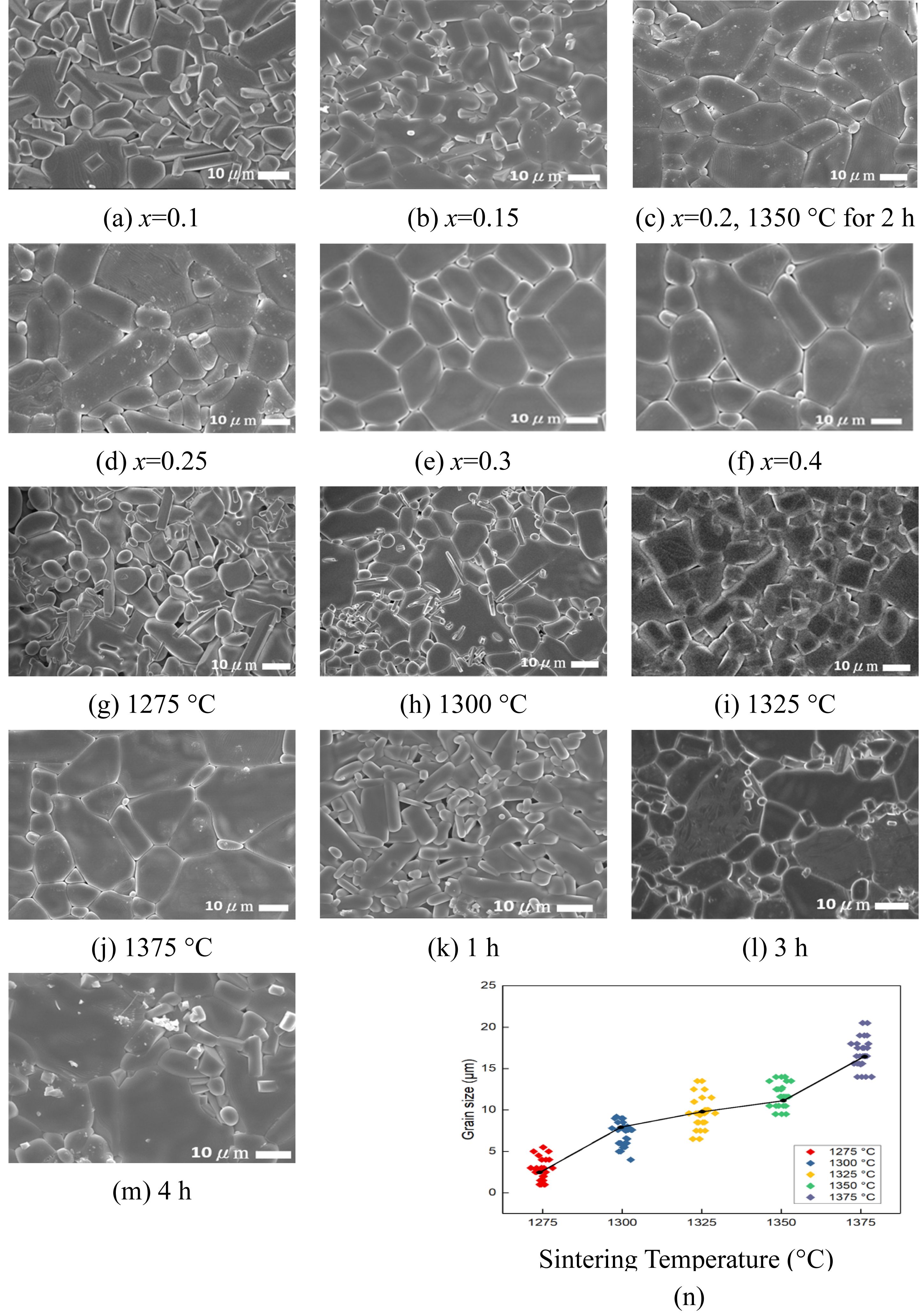 Microstructural evolution with varying sintering temperatures (Fig. 2g–j) further supports these observations. At lower temperatures (e.g., 1275 °C), incomplete densification and residual porosity are evident. As temperature increases to 1350 °C, the grain size becomes more uniform, and the overall density is maximized. However, at 1375 °C, abnormal grain coarsening and pore growth occur, indicating over-sintering-induced grain boundary migration and potential phase decomposition.