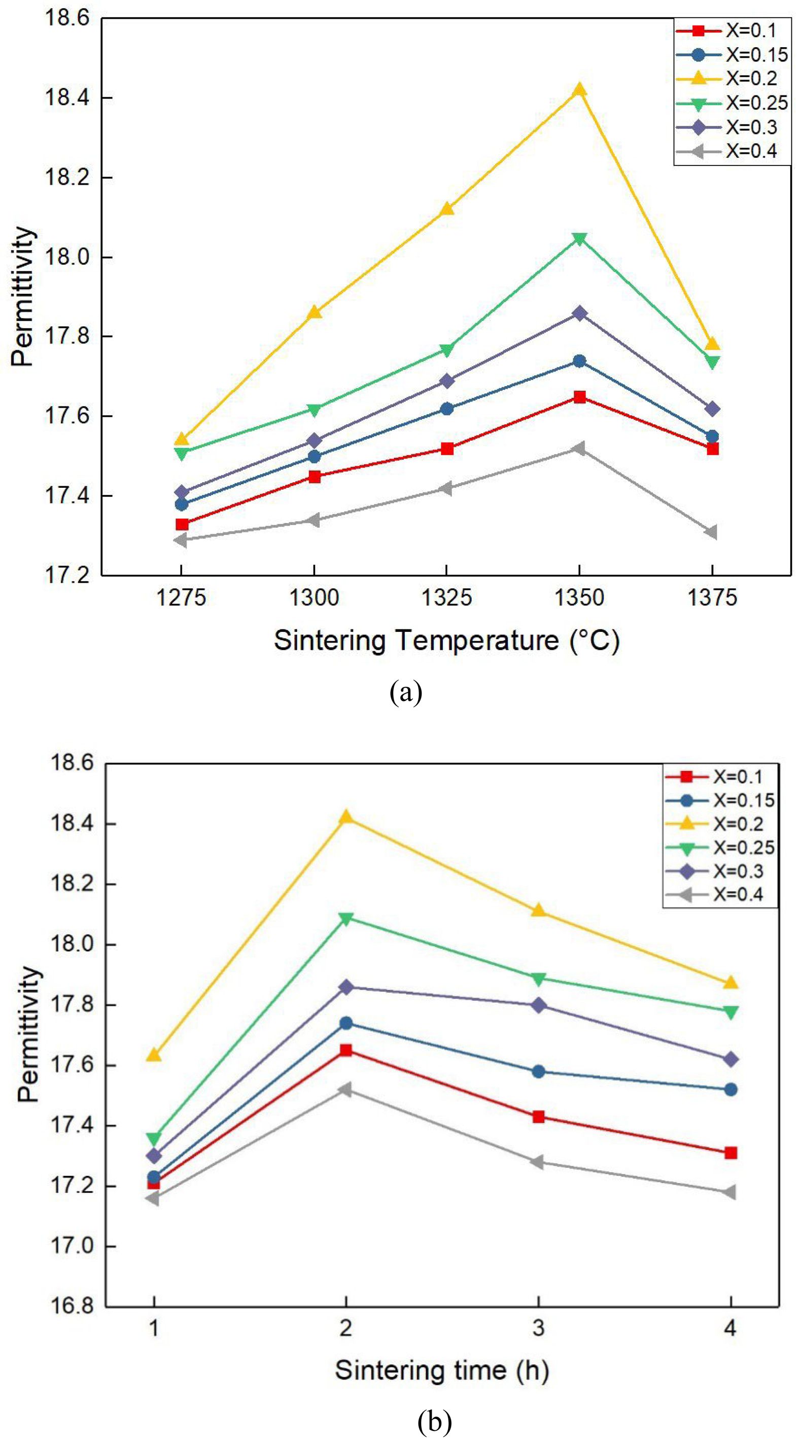 Fig. 5 ermittivity of [(Mg1-xCox)0.95Zn0.05]TiO3 with x=0–0.4 as a function of (a) sintering temperature and (b) time. |