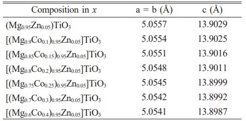 Table 1 Lattice constants of [(Mg1-xCox)0.95Zn0.05]TiO3 ceramics different x compositions sintered at 1350 °C for 2 h. |