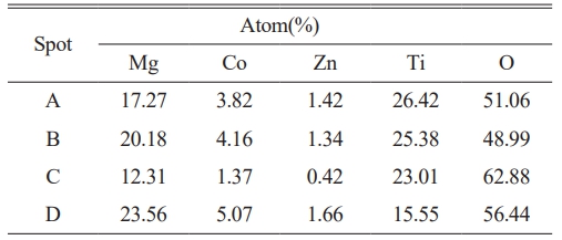 Table 2 The EDS results of [(Mg0.8Co0.2)0.95Zn0.05]TiO3 ceramics at 1350 °C for 2 h. |