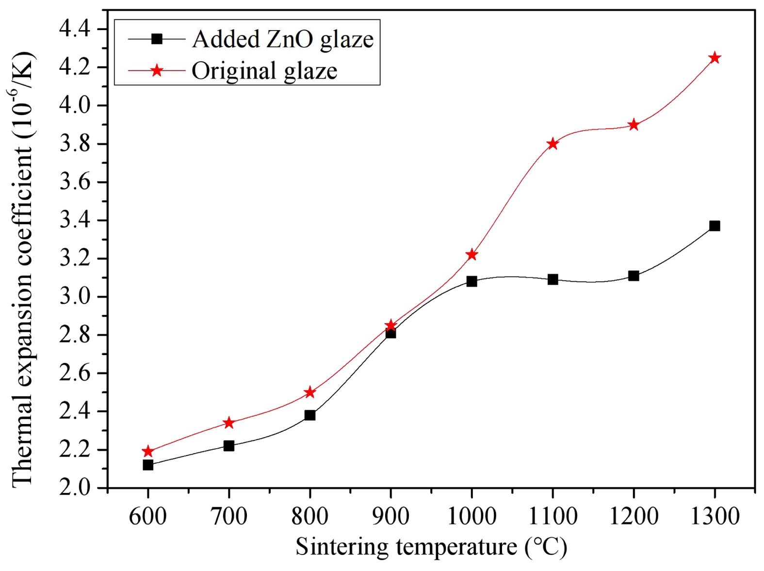 Fig. 2 Effect of sintering temperature on the thermal expansion coefficient of the glaze. |
