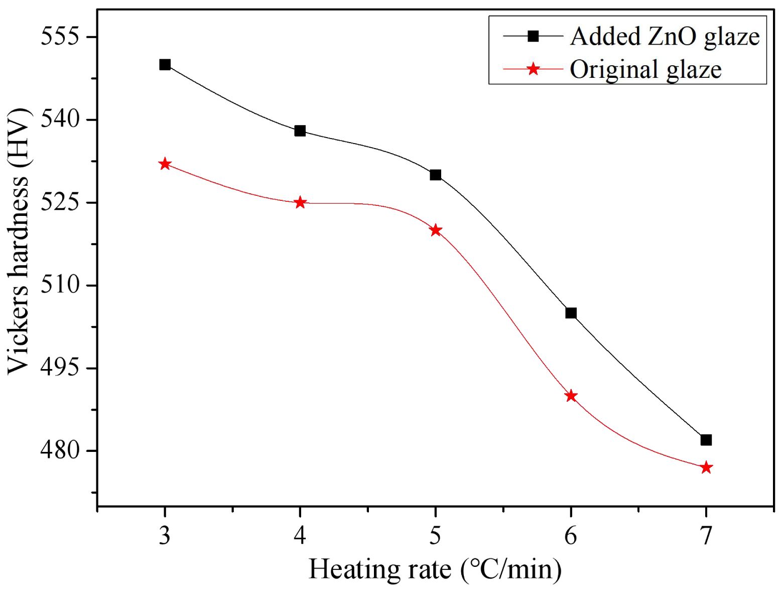The Vickers hardness curves for both original and added ZnO glaze exhibit a downward trend as the heating rate increases in Fig. 7. This phenomenon occurs because rapid heating does not allow sufficient time for the glaze components to diffuse and recrystallize. Grain growth necessitates a specific duration and temperature, and while fast heating can elevate the glaze to a high-temperature state quickly, the grains may not have fully developed. During sintering, certain glaze components melt and create a glass phase. The formation of this phase requires a set temperature and time to ensure complete melting and uniform mixing of the components. A rapid temperature rise can lead to a rushed glass phase formation, resulting in an uneven chemical composition [15, 16]. Such an uneven glass phase fails to effectively fill the interstices between grains, leading to an incomplete glaze structure. Nonetheless, irrespective of the heating rate, the added ZnO glaze consistently exhibit higher hardness than the original glaze. This is attributed to ZnO, which enhances the uniformity of chemical reactions. It ensures that reactions within the glaze proceed evenly, reducing incomplete local reactions. Even under conditions of rapid heating, zinc oxide maintains the uniformity of chemical reactions, thereby increasing hardness. Consequently, ZnO significantly improves the performance of glazes.