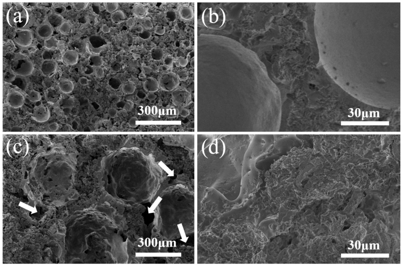Fig. 4 shows the morphologies of porous ceramics prepared from P1 and P2. When the particle size of FAHSs is 100 mesh, the FAHSs in porous ceramics prepared from P2 are uniformly dispersed, and their hollow structures are intact (Fig. 4a). The pores between the FAHSs are completely filled with diatomite and perlite powder, and the resulting ceramic skeleton presents a porous structure (Fig. 4b), which can provide filtering channels and adsorption sites for porous ceramics in application [42]. Hence an obvious hierarchical pore structure is formed in the porous ceramic. When the particle size of FAHSs is 40 mesh, the dispersion of FAHSs in porous ceramics prepared from P1 is relatively uniform (Fig. 4c). The FAHSs are loosely filled with diatomite and perlite powder, and there are partially unfilled areas (indicated by white arrows). The micropores between the filled particles and on their surfaces are clearly seen (Fig. 4d). According to the results in Fig. 3 and Fig. 4, porous ceramics with uniform structure and high compressive strength can be prepared from P2 with 100 mesh FAHSs as the main raw material.