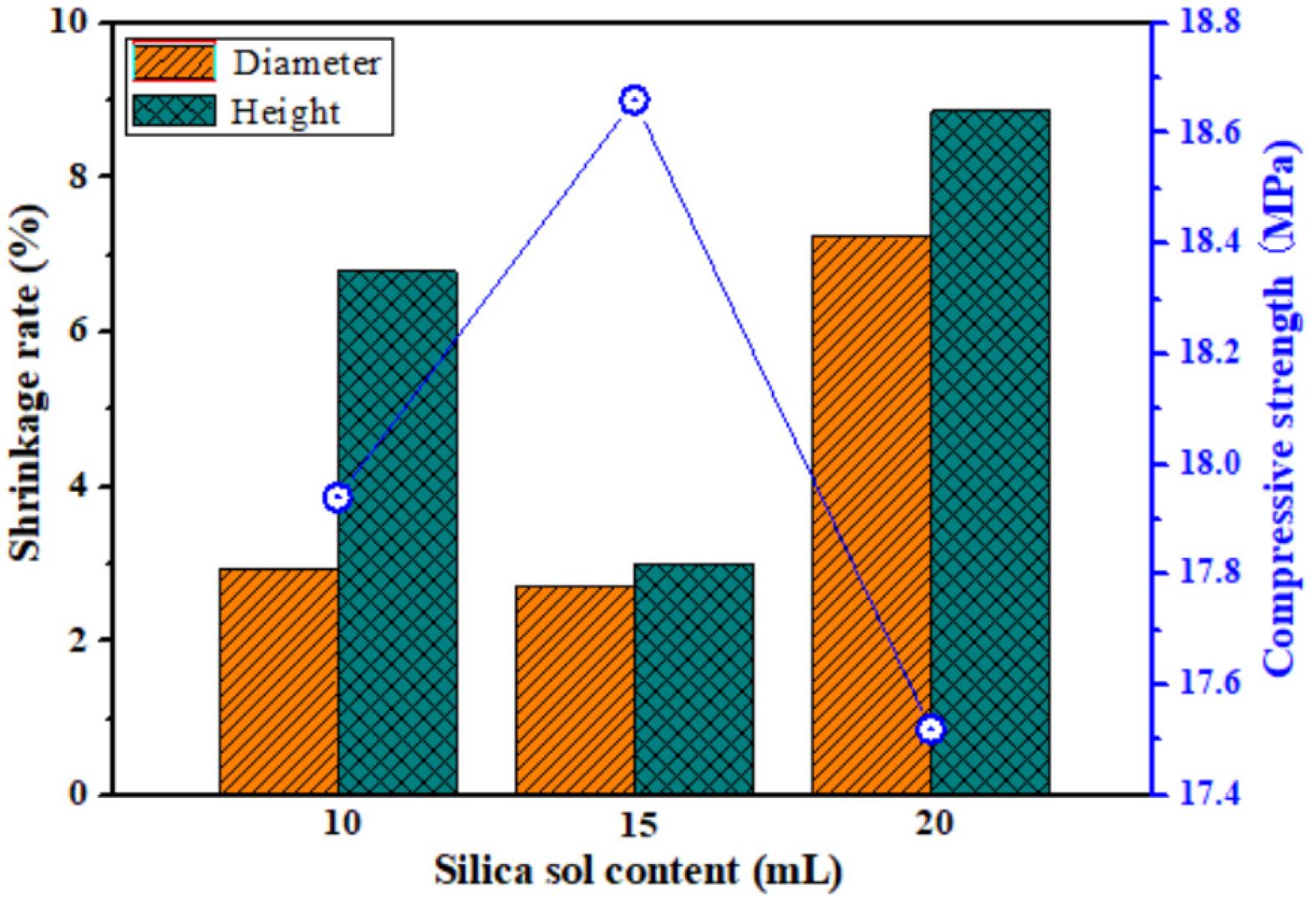 When the amount of silica sol is different, the shrinkage rate and compressive strength of the porous ceramic prepared from P2 are shown in Fig. 8. When the amount of silica sol is 10 mL, the diameter shrinkage rate of the porous ceramic is small (2.94%), but its compressive strength is low (17.94 MPa). Because silica glasses can be prepared from silica sol sintered at 900-950 ℃ [47-50], less amount of silica sol will result in less liquid phase formed by silica sol between ceramic particles, and weak adhesion between particles will result in relatively low compressive strength of porous ceramics. With the increase of silica sol content from 15 to 20 mL, the compressive strength of porous ceramics decreases from 18.66 to 17.52 MPa, and their diameter and height shrinkage rate increase by 4% and 5%, respectively. Therefore, when the amount of silica sol is 15 mL, the prepared porous ceramics have higher compressive strength and lower sintering shrinkage.