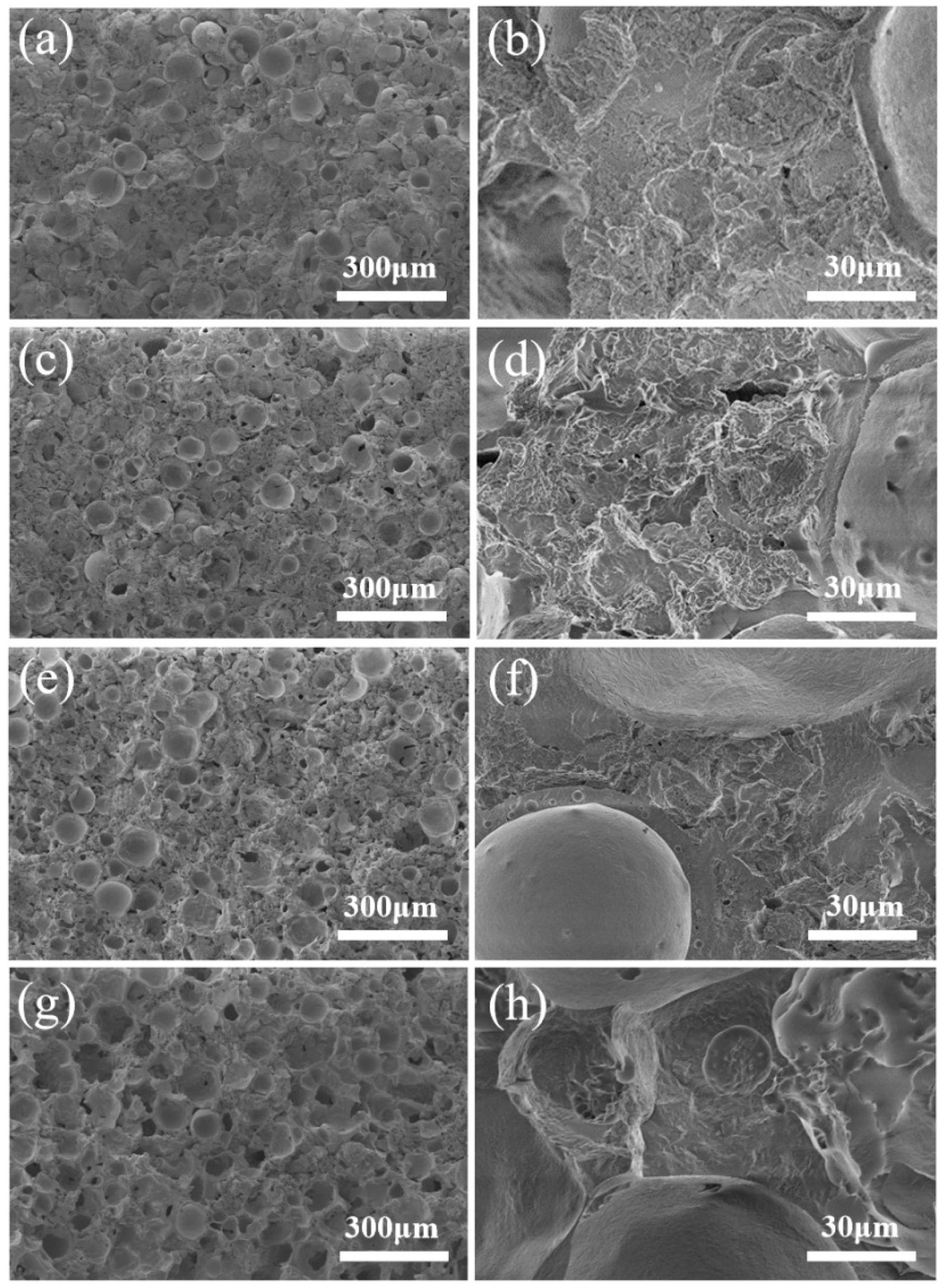 Fig. 11 shows the microstructures of porous ceramics prepared from P2 at different sintering temperature. When the sintering temperature is 1000 ℃, there are some complete FAHSs in the cross section of porous ceramics (Fig. 11a), indicating the formation of weak sintering necks between ceramic particles [36]. Almost no liquid phase is formed in the ceramic powders filled between the FAHSs, and their surface micropores are clearly seen (Fig. 11b). In Fig. 11c-h, when the sintering temperature increases from 1100 to 1300℃, almost no complete FAHSs can be seen in the section of porous ceramics, indicating that the FAHSs are firmly interconnected with the filled powders, which is consistent with the results in the literature [36, 40]. However, when the sintering temperature increases, the liquid phase in the ceramic powder filled between the FAHSs gradually increases. When the sintering temperature is 1300 ℃, too much liquid phase is formed in ceramic powders, which may be the reason for the decrease of compressive strength of porous ceramics.