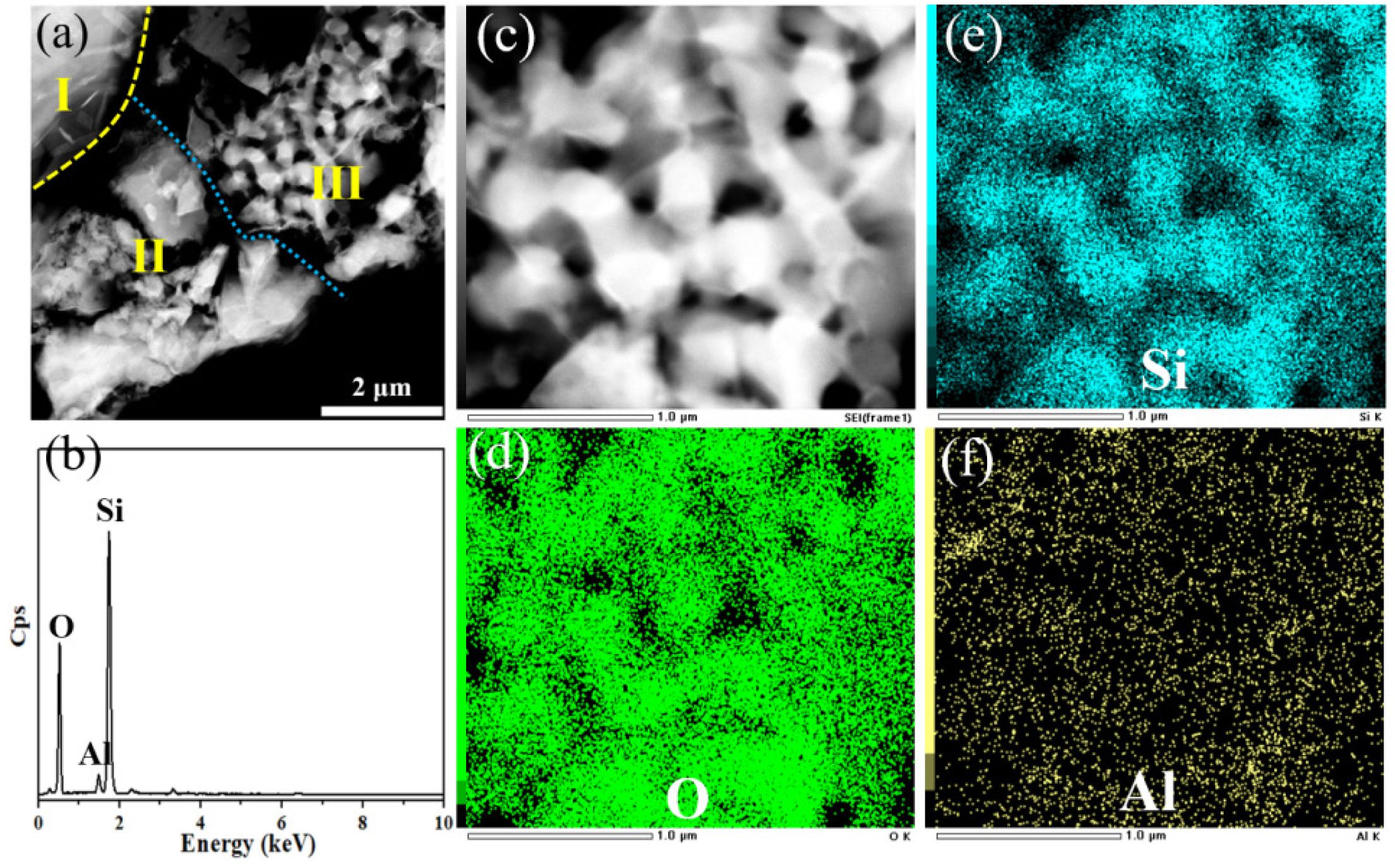 Fig. 12 (a) TEM image of microstructure of porous ceramic prepared from P2 at 1200 °C; (b) EDX spectrum of area Ⅱ and area Ⅲ and (c-f) element mapping of area Ⅲ in (a). |