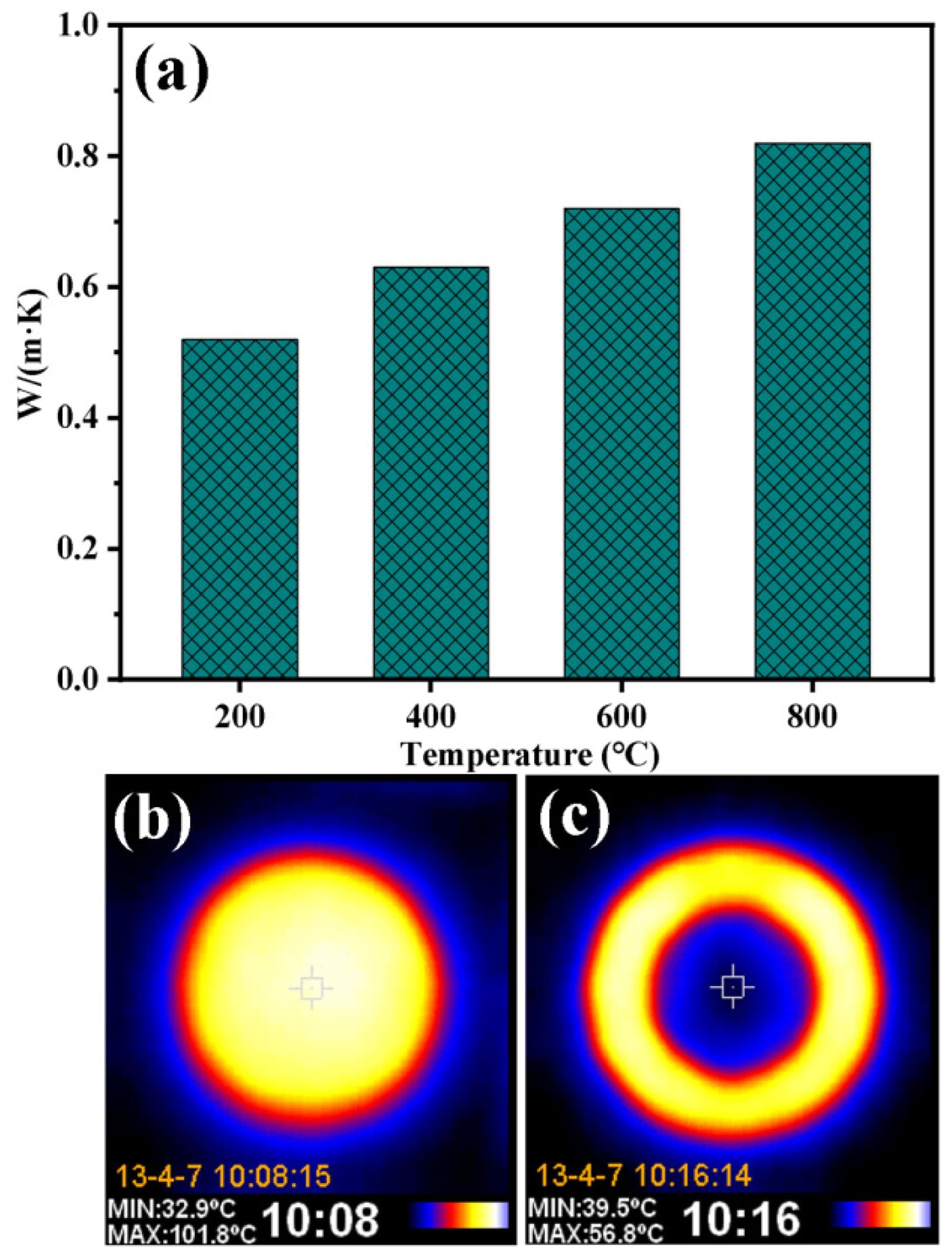 Fig. 13 shows the variation of thermal conductivity of porous ceramics prepared using P2 at 1200 °C as a function of temperature. When the test temperature increases from 200 to 800 °C, the thermal conductivity of the samples is 0.52-0.82W/m·K, and their thermal conductivity increase slowly with the increase of temperature. When the sample is heated on the test plate at 102 ℃ for 300 s, its upper surface temperature is only 44 ℃, which indicates that it has good thermal insulation performance.
