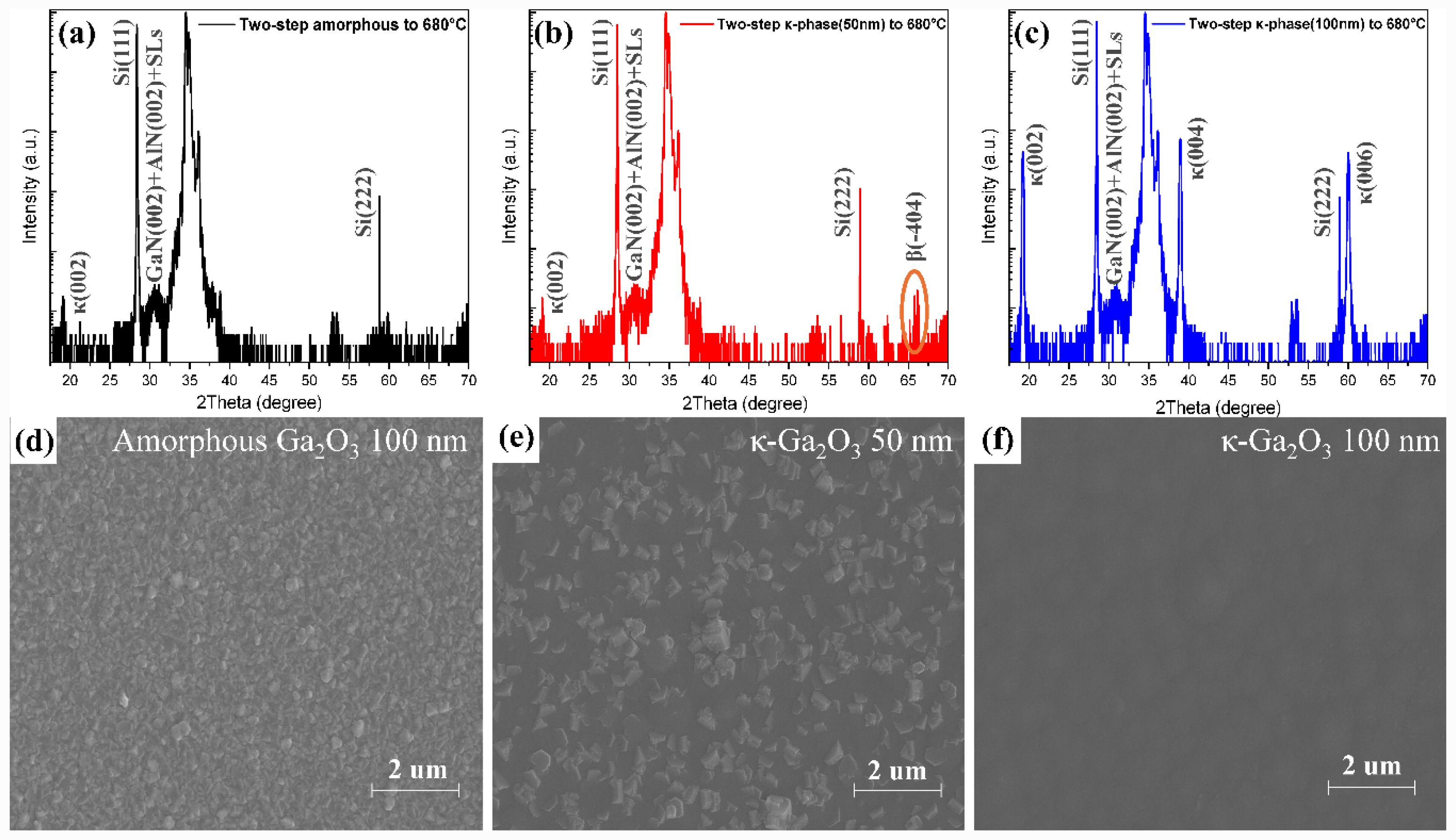 Based on the nucleation layer results in Fig. 2, Two-step epitaxial growth was performed under the same conditions (680 °C, H₂O: 600 sccm) that led to significant β-phase formation in the direct growth process, as shown in Fig. 1. Fig. 3(a) and (d) show the results for the sample grown on an amorphous Ga₂O₃ nucleation layer. Despite being processed under conditions favorable for κ-phase formation, XRD analysis revealed no Ga₂O₃ related diffraction peaks. SEM imaging revealed a rough surface with highly disordered, random grain orientations. These findings suggest that the amorphous buffer layer disordered structure significantly disrupted the subsequent epitaxial growth. Fig. 3(b) and (e) display the data for the sample grown on a 50 nm thick κ-Ga₂O₃ nucleation layer. The XRD and SEM results were similar to those of the amorphous buffer layer sample, indicating continued disorder in the overgrown film. The limited suppression of threading dislocations by the thin nucleation layer led to disordered crystal orientation, which persisted after epitaxial growth, resulting in a rough and randomly textured surface. A weak peak, likely corresponding to β-Ga₂O₃ (-404), was detected (marked by the orange circle), suggesting phase instability possibly triggered by the structural disorder. Fig. 3(c) and (f) correspond to the film grown on a 100 nm thick κ-Ga₂O₃ nucleation layer. SEM analysis confirmed a smoother surface morphology than the other two cases, indicative of improved crystallographic alignment and uniform growth. Furthermore, no β-Ga₂O₃ peaks were observed in the XRD spectra, and single-phase κ-Ga₂O₃ was maintained. These results demonstrate that, despite the growth conditions being favorable for β-phase formation, the use of a well formed κ-Ga₂O₃ nucleation layer grown via a two-step process effectively suppressed β-phase incorporation, enabling the formation of single-phase κ-Ga₂O₃ films.