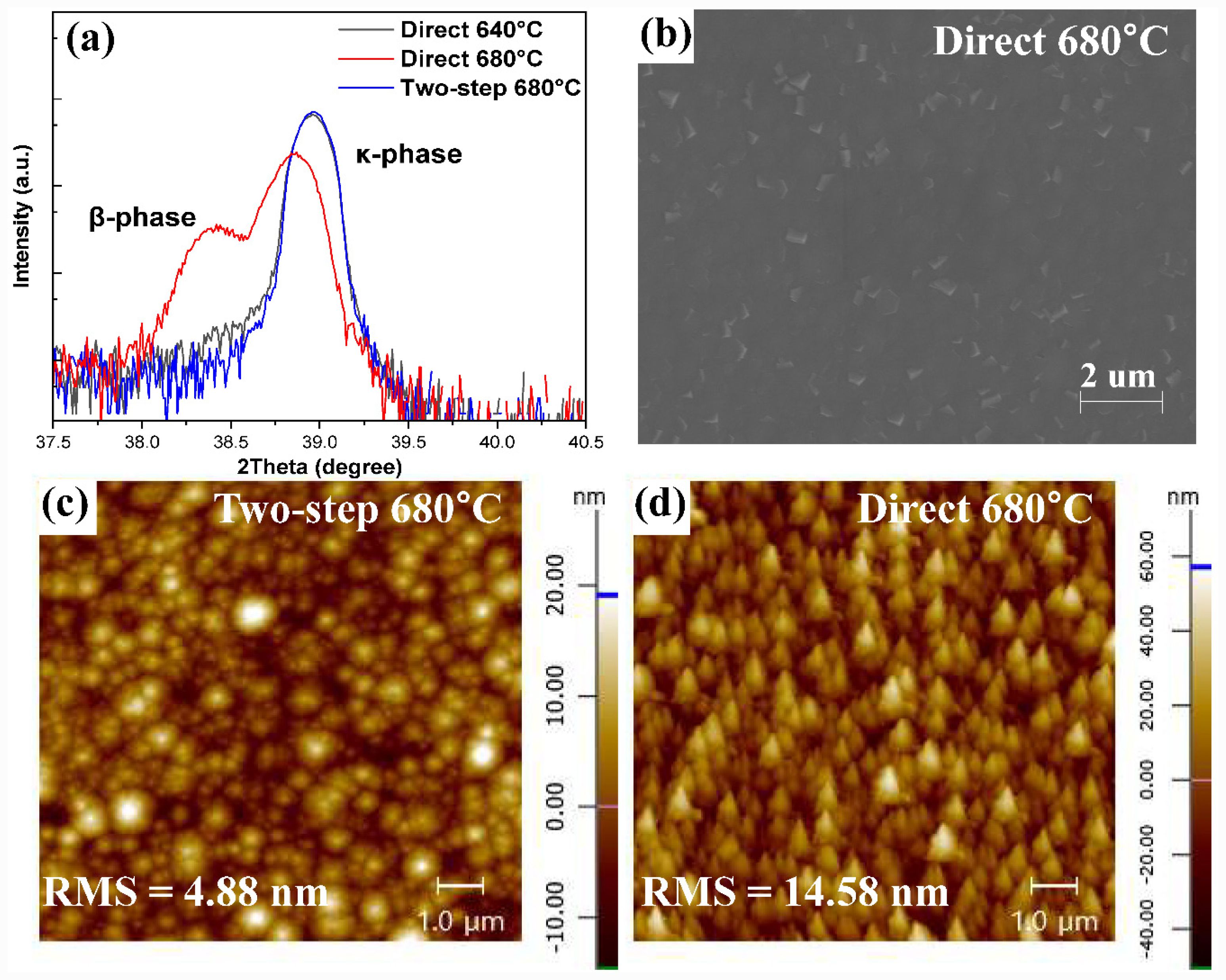 Fig. 4 (a) Magnified 2θ-ω scan spectra near the κ-Ga₂O₃ (004) peak for direct 640 °C, direct 680 °C, and two-step 680 °C samples. (b) SEM image of the direct 680 °C sample. (c) and (d) AFM images of the two-step 680 °C and direct 680 °C samples, respectively. |