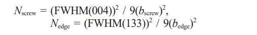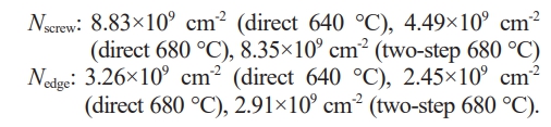 where b is the magnitude of the Burgers vector determined by the lattice parameters of the crystal. For κ-Ga₂O₃, bscrew = 0.291 nm and bedge = 0.926 nm were used in this study [44, 45]. Although a more precise estimation of dislocation densities requires TEM analysis, this study focuses on qualitative and relative comparisons. Based on the calculations, the estimated dislocation densities are as follows,