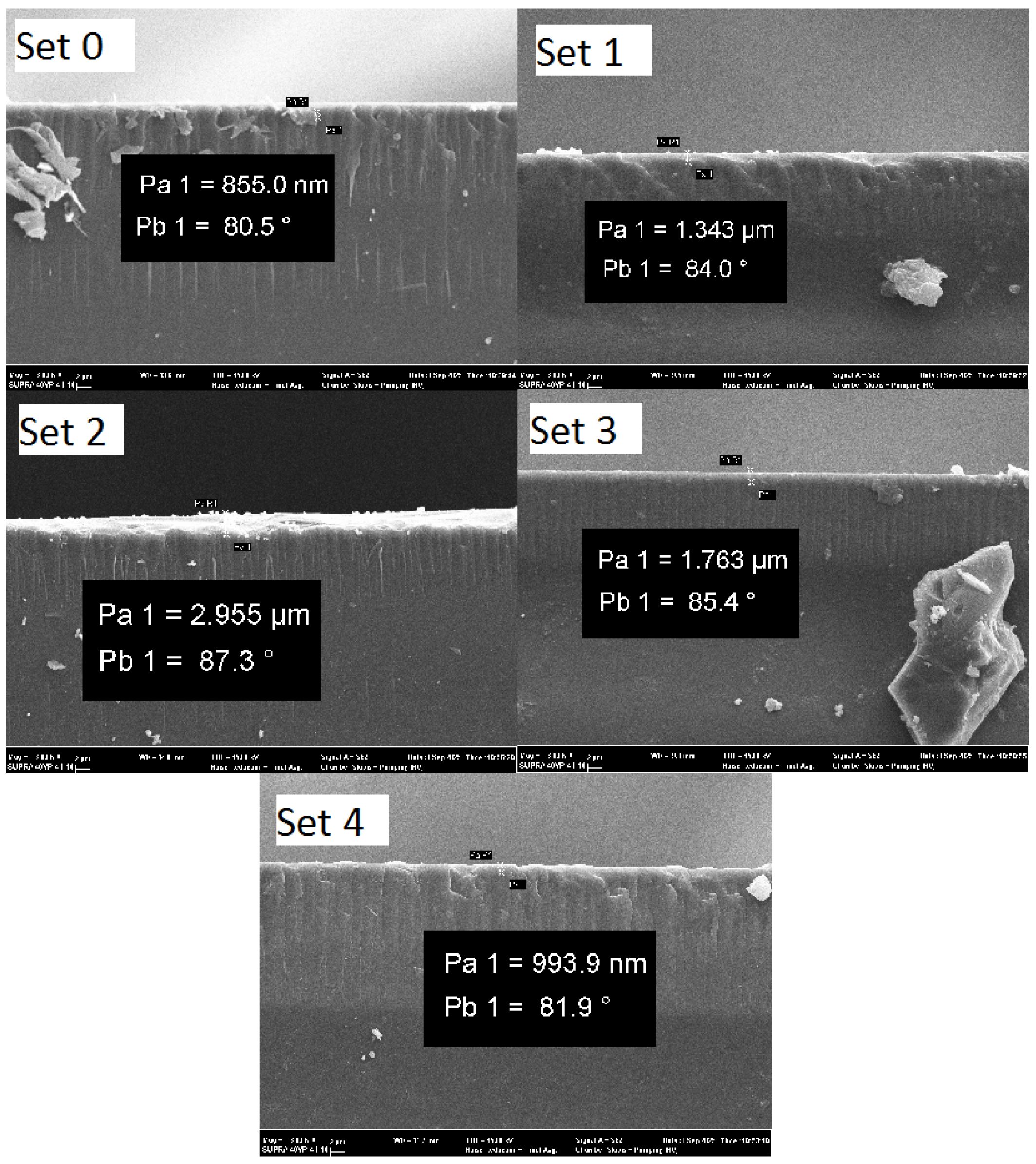 Film thicknesses obtained from SEM images are presented in Fig. 1, with the minimum thickness of 855 nm observed in the reference experiment and the maximum thickness of 2955 nm observed in Set 3. At the end of the experiment, a substantial amount of chemical residue was observed in the reference bath. The residue decreased noticeably in the bath containing 10 mg of inhibitor; however, further increasing the inhibitor concentration resulted in an increase in residue formation. This phenomenon is attributed to heterogeneous nucleation occurring when 10 mg of Na₂SO₃ is used, which is consistent with literature reports emphasizing the role of surface energy manipulation in improving crystallization outcomes [24].