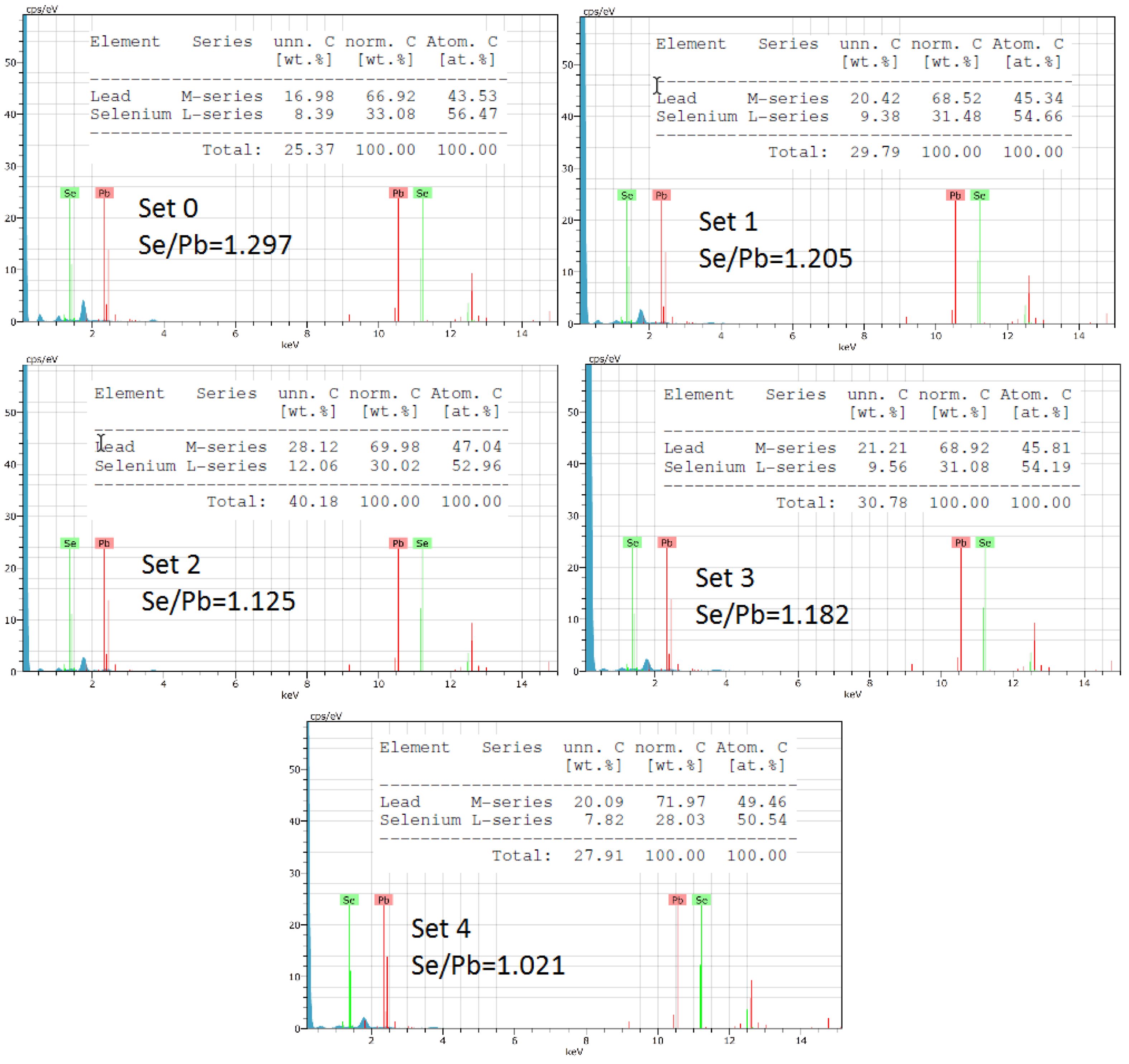 Elemental analysis of the films was performed using EDX to determine the conductivity type of the films. It is known that the type of conductivity of PbSe films depends on their elemental content. Films with a high Pb content are n-type, while films with a high Se content are p-type [31]. This analysis showed that the produced films were Se-rich and concluded that the films had p-type conductivity. Furthermore, as the amount of inhibitor used increased, the Se/Pb ratio almost approached 1. Graphs showing the Se/Pb ratio are given in Fig. 4.