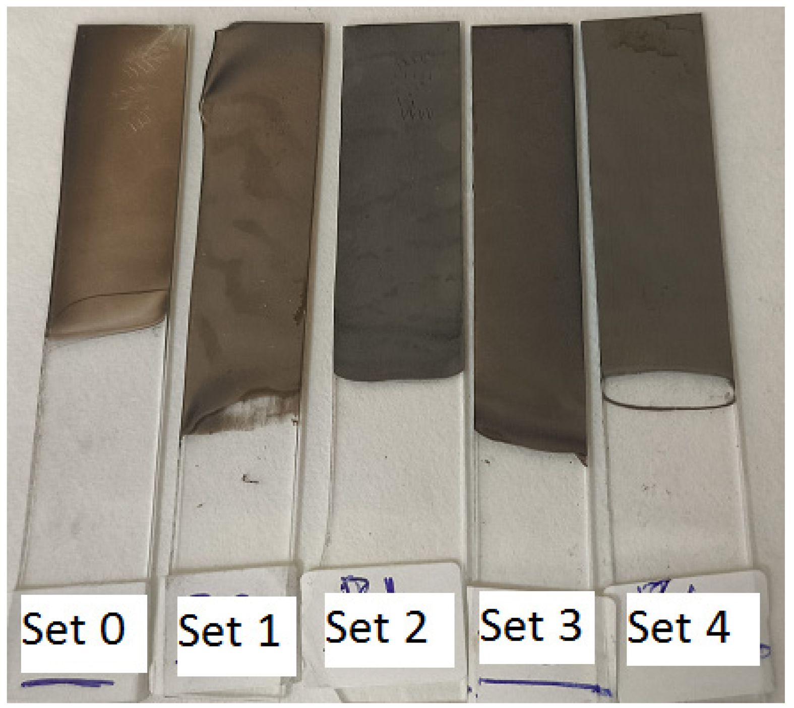 When the images in Fig. 7 are examined, it is seen that the films are coated homogeneously onto the glass substrate. It is assumed that the darkness on the film surface obtained in Set 2 arises due to the relatively high thickness of the film, which is 2955 nm. Furthermore, it is noticeable that all of the films were coated quite homogeneously and smoothly on their surfaces. No defects are observed on the sample surfaces, especially those using 15 mg and 20 mg inhibitors.