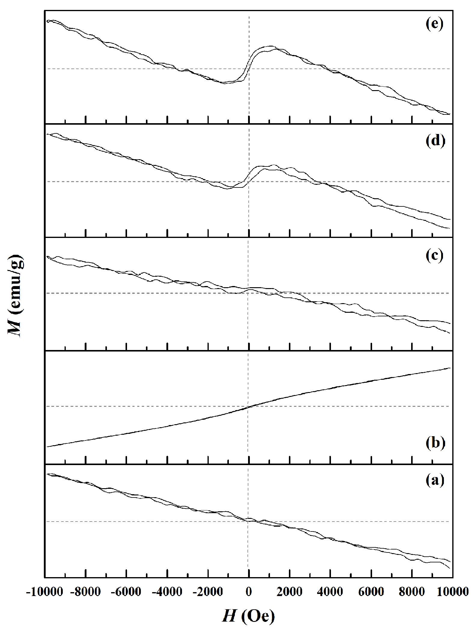Fig. 7 Magnetic hysteresis curves of (a) CA, (b) Fe-CA, (c) Ni-CA, (d) Cu-CA, and (e) Zn-CA powders. |