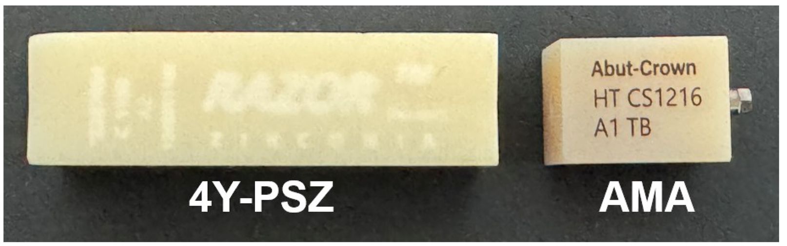 Two types of specimens were studied–that is, 4Y–PSZ (Razor 1100) and AMA samples. The AMA sample was sintered at 840oC for 15 min using a dental furnace (Austromat 624i, Dekema Dental–Keramiköfen GmbH, Freilassing, Germany). The heat-treated ceramic blocks (Fig. 1) were manufactured as discs with a diameter of 12 mm and a thickness of 0.6 mm. The specimens were then ground, polished, and glazed until they reached their final crystalline form. Before glazing, alumina particles (50 µm) were sandblasted using a dental sandblaster (Basic eco, Renfert GmbH, Hilzingen, Germany) at a pressure of 2 bar and an angle of 70° with a spray gap of approximately 10 mm. The spray was maintained for 20 s.