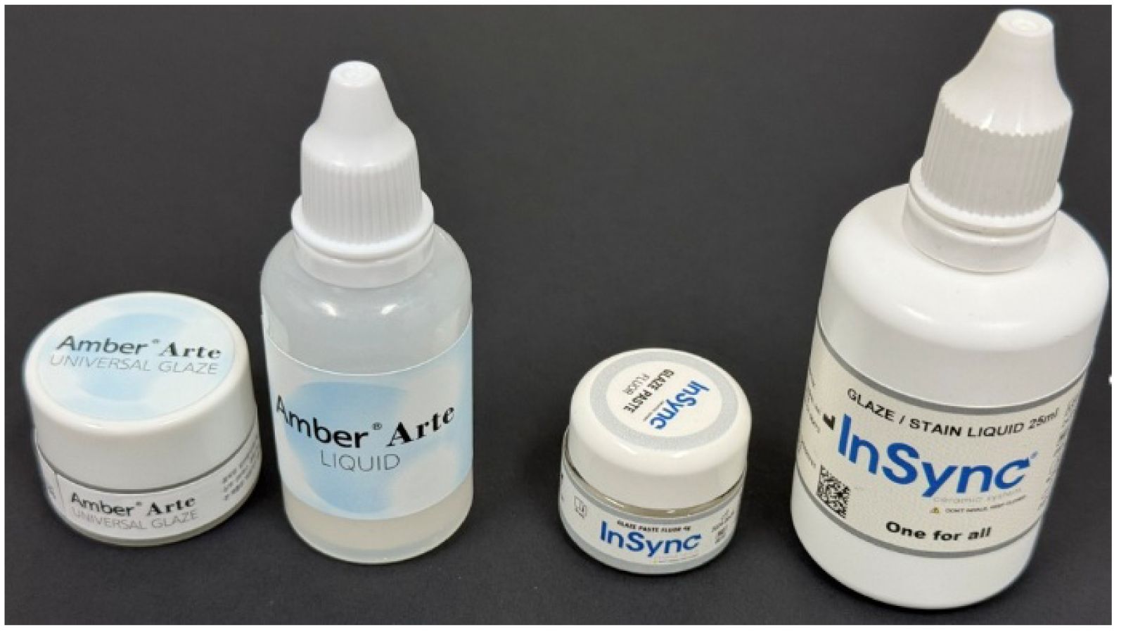 Fig. 2 Photographs of the glaze kits: the Amber® Arte and Insync® glaze pastes and liquids. |