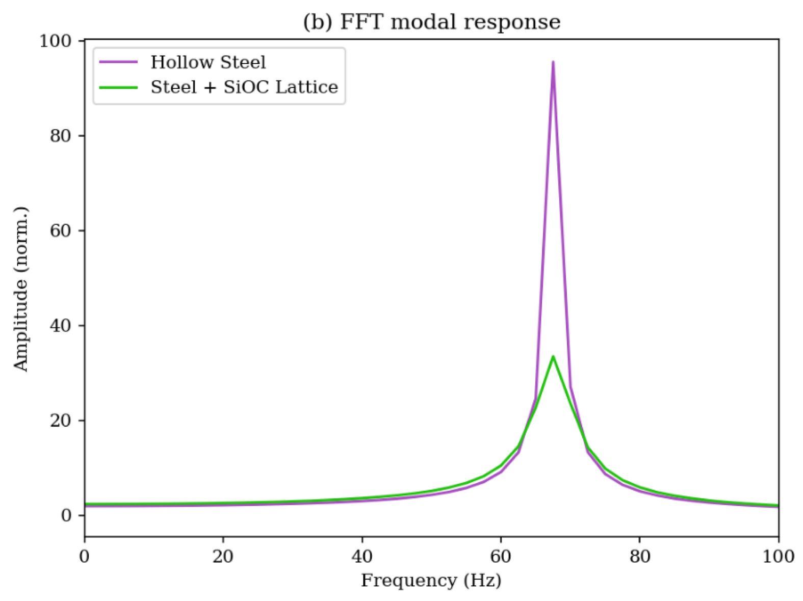 Frequency-domain analysis further supports this effect. As shown in Fig. 2, the reference hollow steel bar displayed a sharp modal peak at ~72 Hz. The same mode for the SiOC-integrated bar shifted downward to ~66 Hz and broadened with reduced amplitude. The downshift indicates a reduction in effective bending stiffness due to the compliant lattice insert, while the peak broadening and amplitude reduction are characteristic of increased modal damping. Such tailoring of vibrational behavior would allow manufacturers to tune “whip” characteristics based on specific strength disciplines, wherein Olympic lifting often benefits from delayed resonance while powerlifting benefits from suppressed oscillation [21, 22].