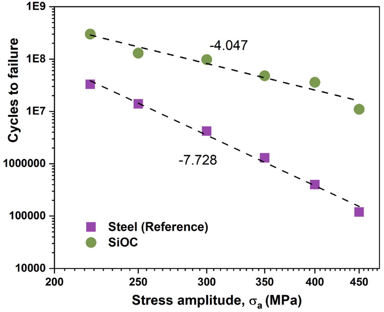 Fatigue performance showed a contrasting trend. The S–N data in Fig. 3 revealed that for a given stress amplitude, the SiOC-reinforced bar sustained a greater number of cycles before failure compared to the reference steel bar. Linear fits to the log–log S–N data yielded slopes of −7.728 for steel and −4.047 for the SiOC-integrated configuration. Although negative slopes are expected reflecting decreasing fatigue life with increasing stress amplitude the reduced magnitude for the SiOC configuration indicates a less severe degradation rate. At high-cycle fatigue levels (10⁷–10⁹ cycles), the SiOC lattice redistributed internal stresses along the bar axis, limiting crack initiation sites and delaying microstructural damage accumulation. These results demonstrate that internal mechanical regulation can enhance fatigue resistance without requiring changes to the bar’s external metallurgy.