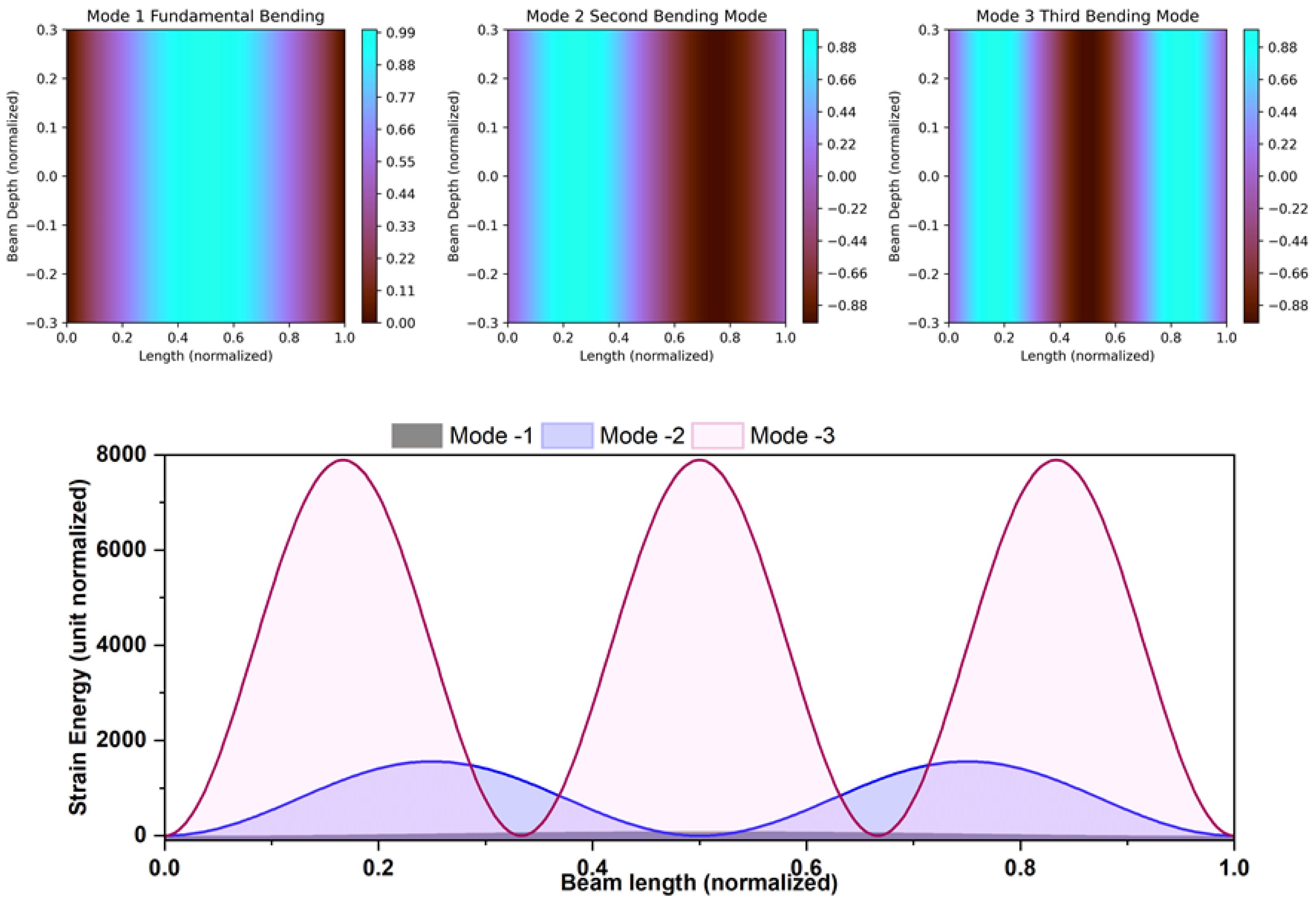Figure 4 presents the computed bending mode shapes and corresponding strain energy distributions of the beam structure for the first three bending modes under free-free conditions. The contour plots reveal the characteristic spatial deformation patterns for each mode, while the energy plots quantify the localization trend of modal strain energy along the beam length.